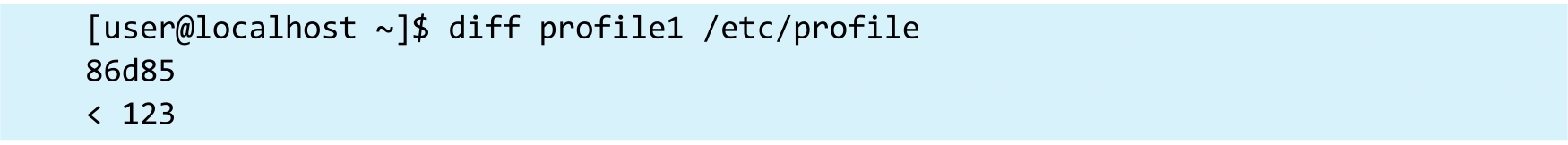 使用diff来比较 /etc/profile和当前目录下的profile1,命令如下,如果没有任何输出,则说明两个文件完全相同,如果有输出,则说明两个文件不同,输出的部分就是两者不同的部分,如下所示:86表示profile1的第86行,d85表示/etc/profile的第85行,<后面的内容表示从profile1的第86行起始的内容,也就是和/etc/profile不同的部分。