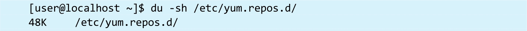 du命令可以统计指定目录下所有文件总的占用空间大小,例如统计 /etc/yum.repos.d目录下所有文件总的占用空间大小,如下所示,总的大小为48K,其中 -s选项用来统计总的占用空间大小,-h表示使用可读的形式显示大小,如2K、5M或8G等。