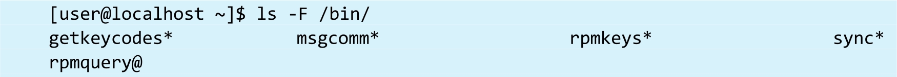 使用 -F选项,列出/bin下所有文件,如下所示,所有可执行文件名后加了 * 扩展名,链接文件后面加了 @ 扩展名。