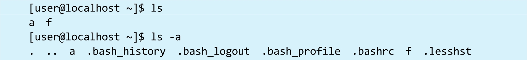 示例命令如下,其中-a表示列出所有文件,包括隐藏文件,如果不加-a,ls只列出了a和f两个文件,加上-a后,除了a和f外,还有很多以“.”开头的文件,如.bash_history、.bash_profile等,这些都是Linux下的隐藏文件,使用-a选项就可以把它们都显示出来。此外,每个目录下都有两个特殊的目录:第一个是当前目录,用一个点(.)表示;第二个是父目录,用两个点(..)表示。