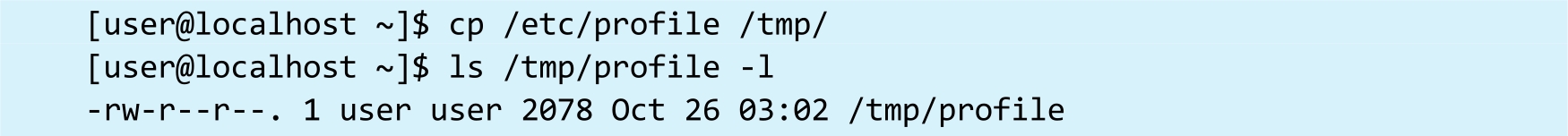 将/etc/profile文件复制到/tmp,复制后的文件名字不变,命令如下,使用ls可以验证复制操作是否成功。