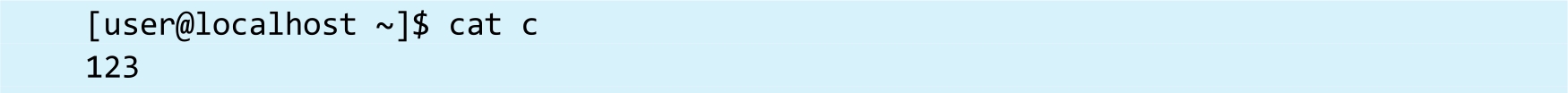 如上所示,echo将字符串123输出到stdout,>是重定向符号,它表示将echo的stdout的内容输出到文件c中,而不是打印在屏幕上。因此,上面的命令会生成新文件c,内容是123。使用cat命令输出c的内容,进行验证,如下所示。