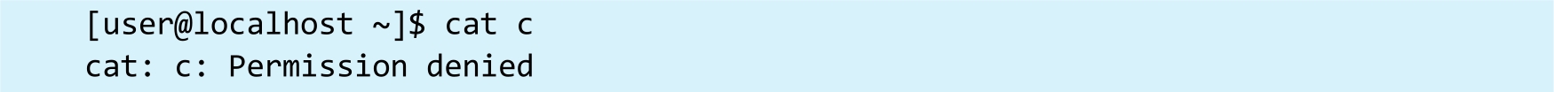 如下所示,文件c的Owner(user)的read权限去掉后,在user用户下用cat命令打印文件c的内容,就会提示Permission denied。