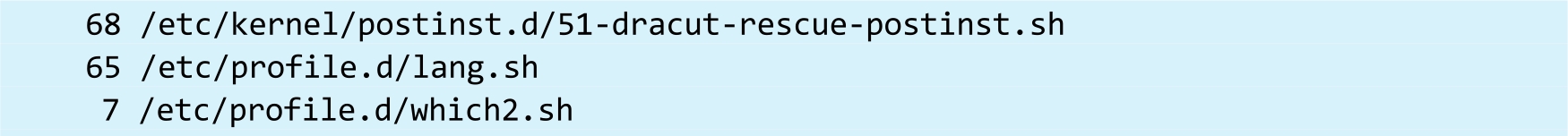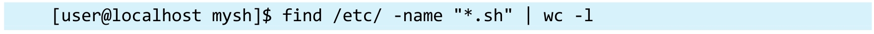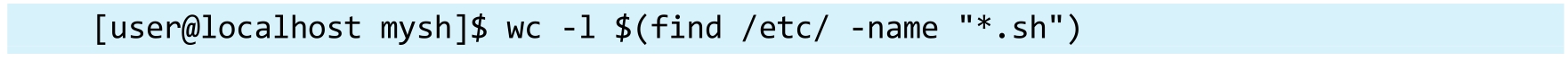 为什么输出结果不是每个文件的行数呢?这是因为,find的输出是一个整体,其中包含了10个sh文件的绝对路径,以此作为wc的输入(这个输入可以认为是一个文件,该文件包含了10条绝对路径),因此,wc的输出就是10。而在前面的-exec或$(find /etc/ -name "*.sh")中,find的输出被分解成了一个个的参数(共10个),wc会对每个参数进行处理,从而输出每个文件的行数。