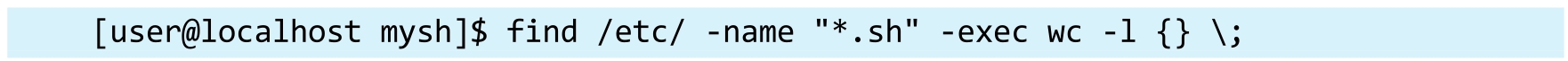 本例使用find + -exec统计/etc下扩展名为sh的文件的代码行数,命令如下,wc用来统计文本文件中的行数,-l是选项,表示打印行数。