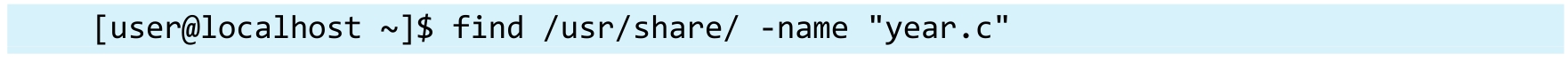 假设用户要查找文件year.c,仅知道该文件位于 /usr/local目录下,但具体位于哪个子目录下不清楚。因此,需要使用find命令,来确定year.c的完整路径,具体命令如下,/usr/share是要查找的路径,-name指定查找对象的名字,即year.c。注意命令、选项和参数之间都要有空格。