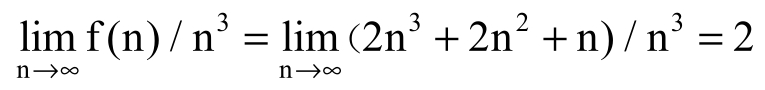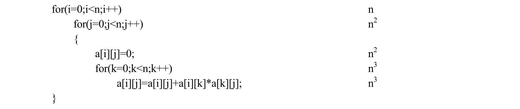 每一条语句的最右端是对应语句的频度,即语句的执行次数。上面算法总的执行次数为f(n)=n+n 2 +n 2 +n 3 +n 3 =2n 3 +2n 2 +n。