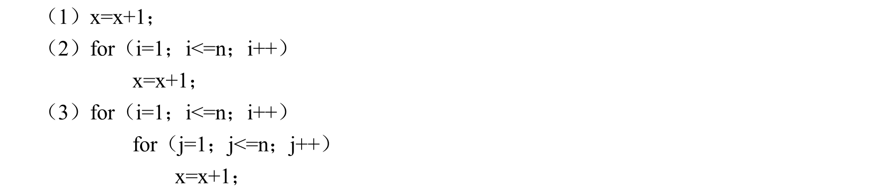 一般情况下,随n的增大,T(n)的增长较慢的算法为最优的算法。例如,在下列三段程序段中,给出基本操作x=x+1的时间复杂度分析。