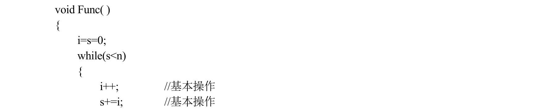 该算法中的基本操作是while循环中的语句,设while循环次数为f(n),则变量i为从0到f(n),因此循环次数为f(n)*(f(n)+1)/2≤n,则