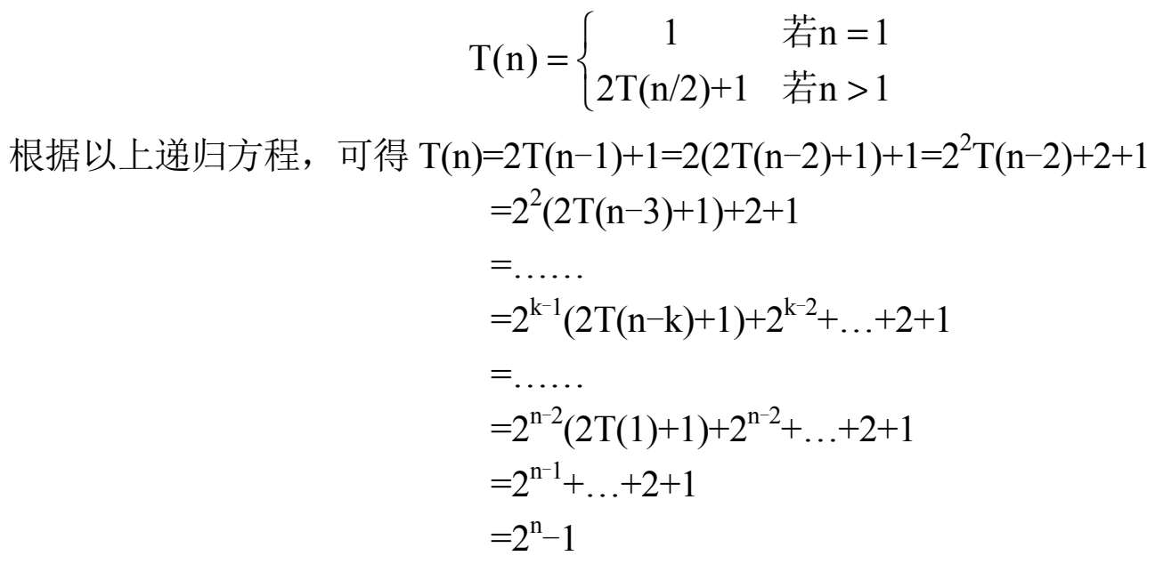 则有S(n)=S(n-1)+1=S(n-2)+1+1=…=S(1)+1+1+…+1=O(n)。因此,该算法的空间复杂度为O(n)。