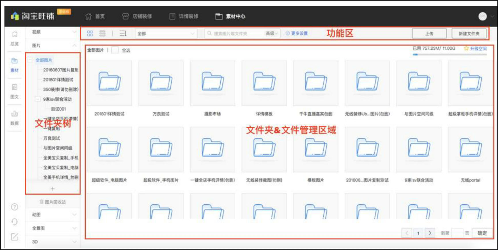 左边区域是“文件夹树”,上方区域是“功能区”,中间区域是“文件夹&文件管理区域”。图片空间的功能主要集中在文件夹树和功能区两个区域。