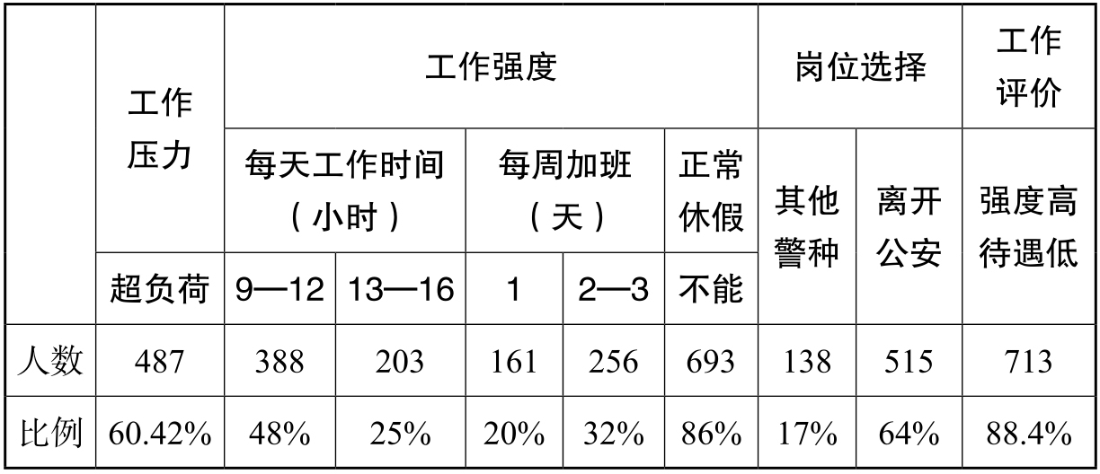 由于工作强度大,待遇保障达不到期望值,加上内部执法要求趋严和外部群众要求趋高的双重压力,导致一些派出所民警的荣誉感、认同感在不断降低。从2010年浙江某地级市治安支队对全市派出所民警的问卷调查情况看(见表1-6;发放1000份问卷,有效调查问卷807份),民警队伍的身心健康和稳定程度令人担忧。