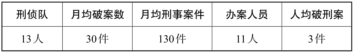 从三个派出所民警月均接处警数量可以看出,派出所职责任务量与现有警力资源之间不平衡(见表1-3)。而且,接处警只是派出所民警的很小一部分工作,这些接处警里面的大量案件需要大量时间去完成,尤其是刑事案件。以Y派出所为例,每天37.2起接处警中,13—15起案件,其中刑事案件3—5起,每个月刑事案件约130件,但是整个派出所刑侦人员13人,每个月能破的刑事案件大约有30件(见表1-4),剩下的100个刑事案件怎么办?