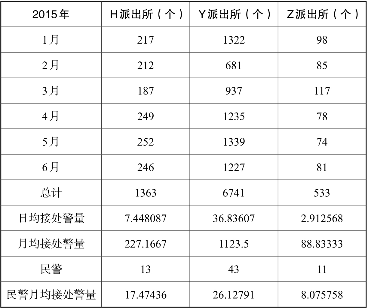 表1-3 2015年1—6月H、Y和Z派出所民警月均接处警数量对比