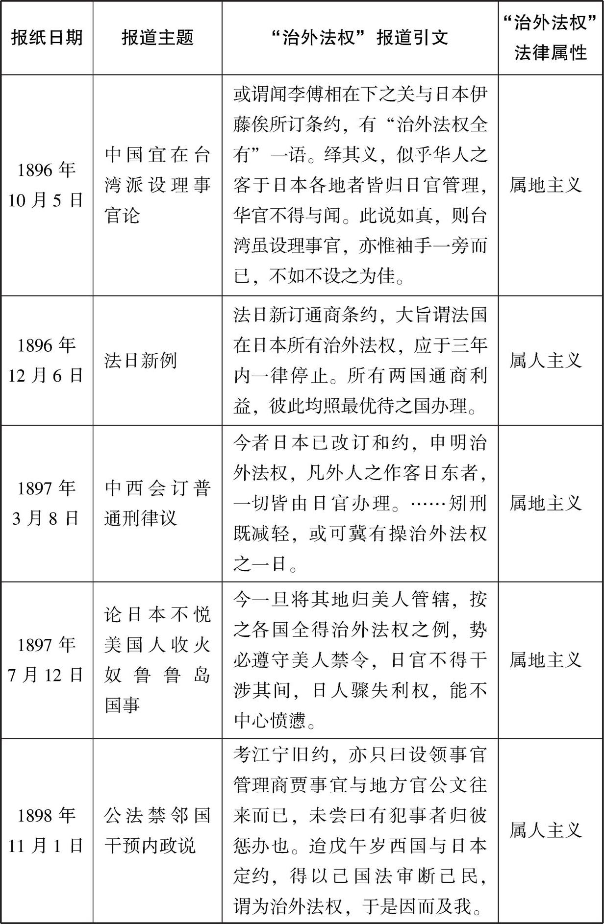 1896年,明治维新后的日本,挟甲午战争胜利之余威,法国承诺放弃在日本的领事裁判权。1896年12月6日《申报》在报道法国和日本签订新的商约时,第一次在“治域之外而有行法之权”的意义上使用了“治外法权”的概念,“法日新订通商条约,大旨谓法国在日本所有治外法权,应于三年内一律停止。所有两国通商利益,彼此均照最优待之国办理”