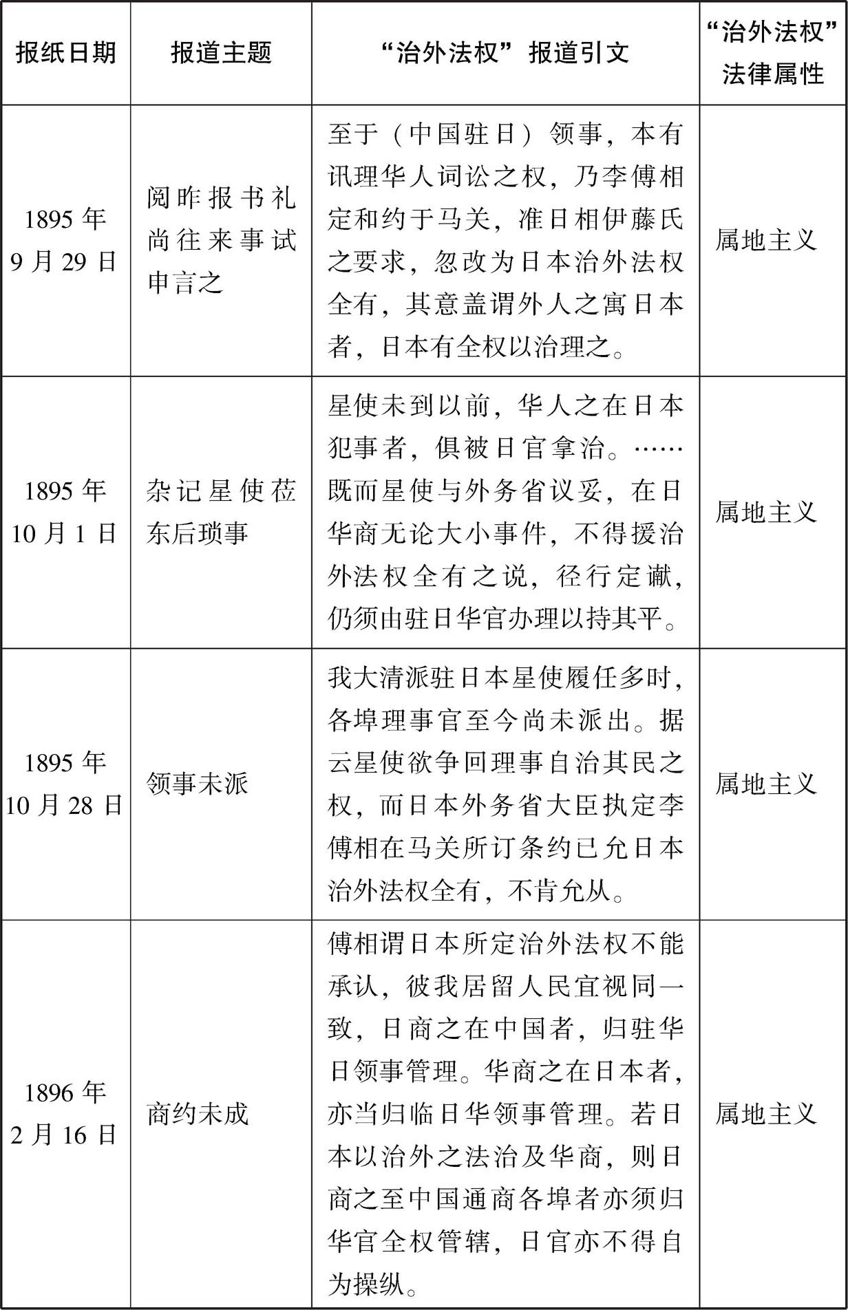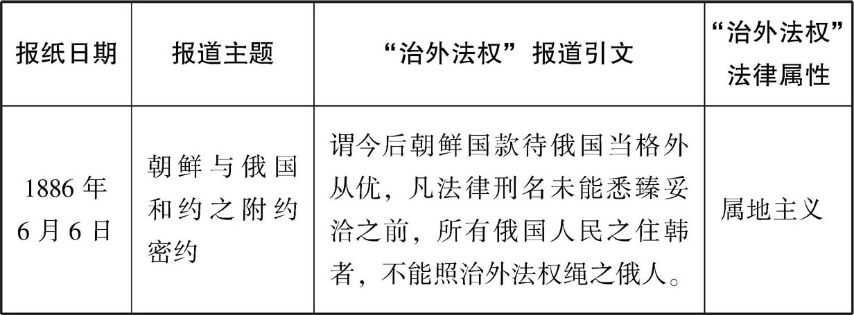 。这里的问题就在于,“治外法权”作为一个中文词汇,真的是黄遵宪在《日本国志》中第一次使用它,并且是受西语和日语的影响而转化来的一个“外来词”吗?本书是不同意这种看法的,下面以《申报》的报道为例予以说明。
