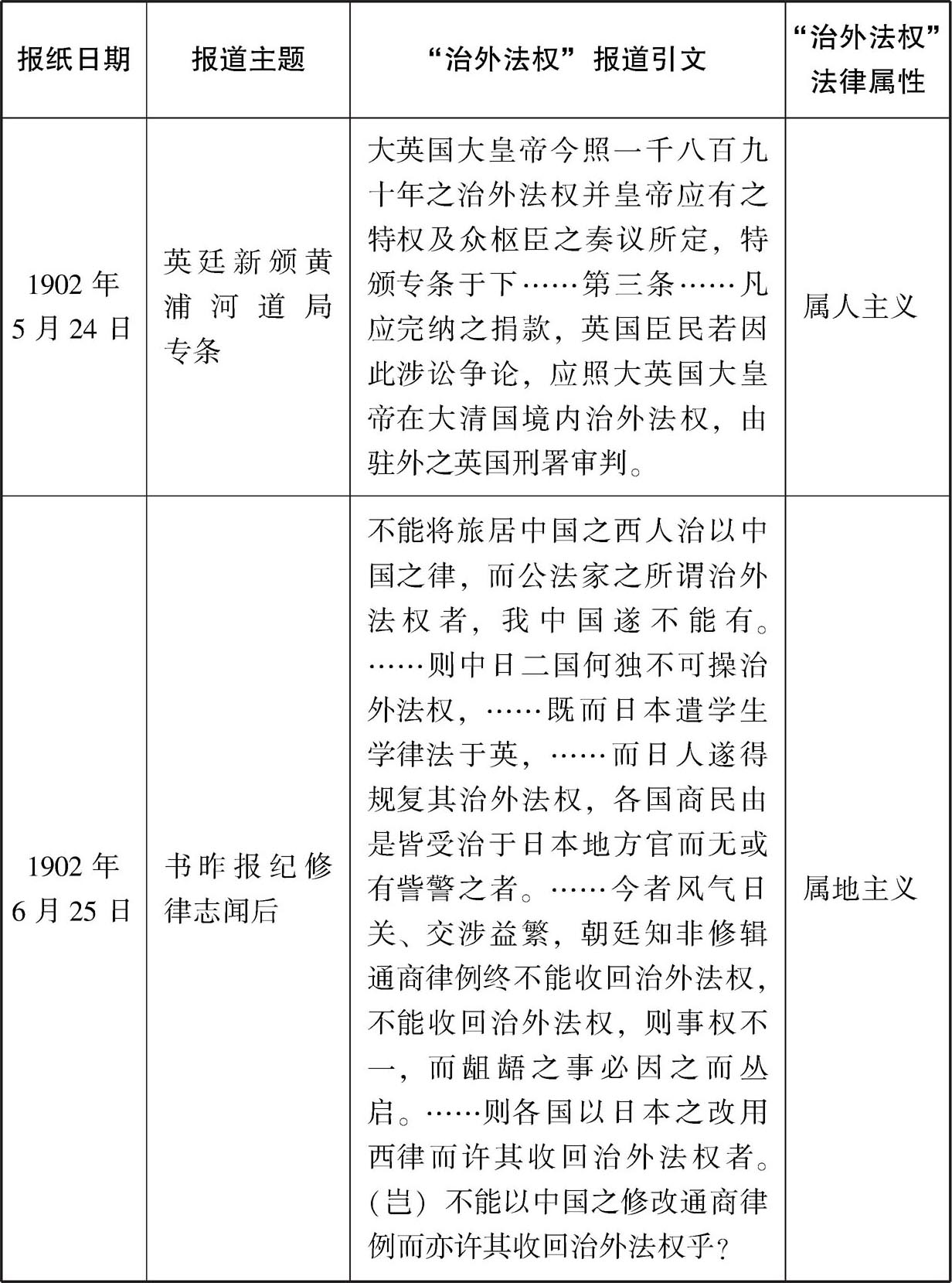 《申报》创刊于1872年,是上海公共租界内较早的中文报纸。1886年6月6日(光绪十二年五月初五)《申报》中第一次出现“治外法权”一词,截至1902年9月中英商约签订之前,共有十二篇文章、二十二次提及“治外法权”一词,其中绝大多数都是属地主义,间有属人主义含义。具体情况列表如下: