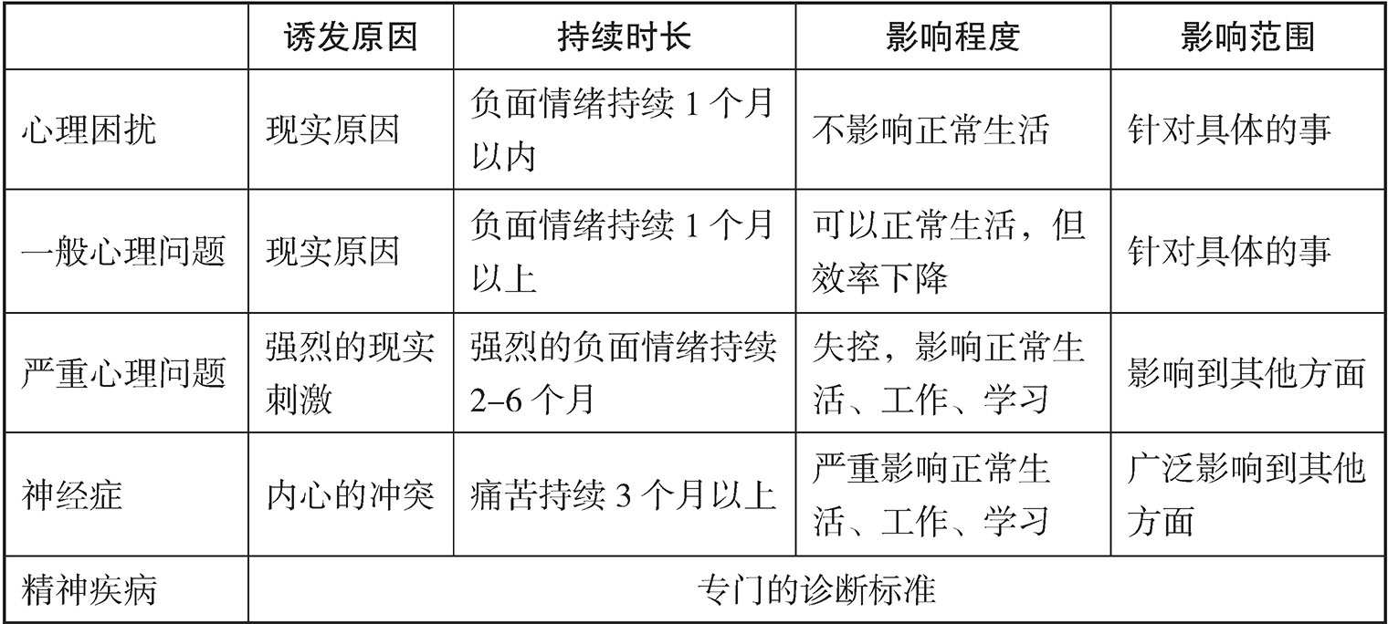 根据以上四个维度,我们一般把心理问题分为五个水平: