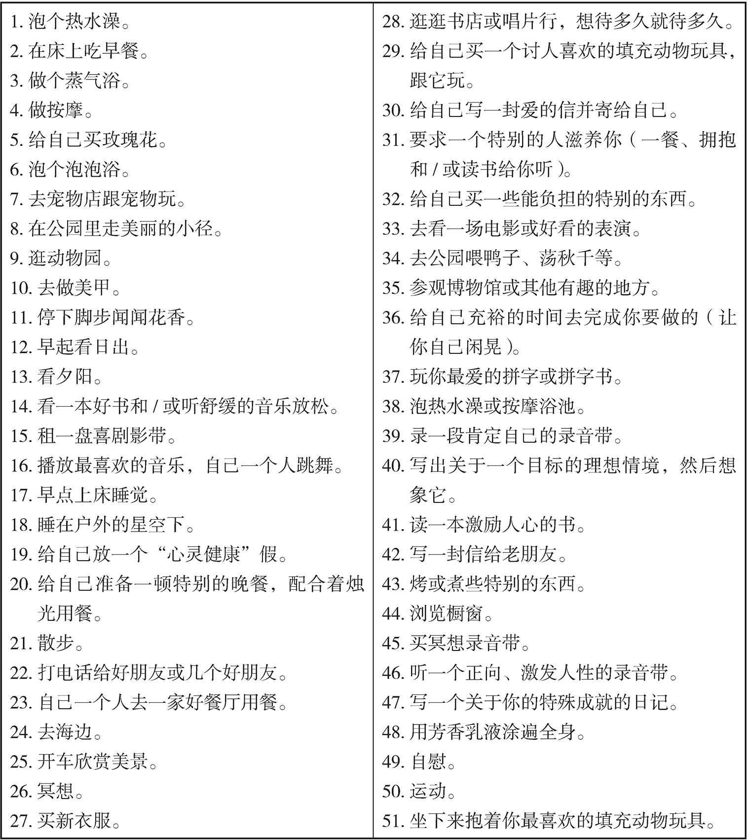 除了觉察自己的情绪、需要,并及时宣泄、满足,我们还需要多做一些让自己身心愉悦的事。以下的自我滋养活动清单,我们可以每天选择做一个,有些我们可能从来没有做过,有些可能不好意思去做,但是如果我们能够坦然享受自我滋养活动的快乐和满足,那么,我们的幸福感会提升很多。