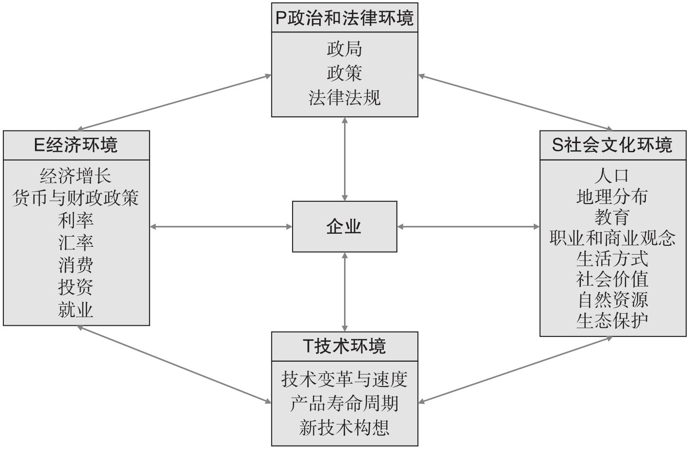 PEST分析法是战略外部环境分析的基本工具,它通过对政治(Politics)、经济(Economic)、社会(Society)和技术(Technology)角度或四个方面的因素分析,从总体上把握宏观环境,并评价这些因素对企业战略目标和战略制定的影响。P即政治要素,是指对组织经营活动具有实际与潜在影响的政治力量和相关的法律、法规等因素。E即经济要素,是指一个国家的经济制度、经济结构、产业布局、资源状况、经济发展水平以及未来的经济走势等因素。S即社会要素,是指组织所在社会中成员的民族特征、文化传统、价值观念、宗教信仰、教育水平以及风俗习惯等因素。T即技术要素。技术要素不仅仅包括那些引起革命性变化的发明,还包括与企业生产有关的新技术、新工艺、新材料的出现和发展趋势以及应用前景。