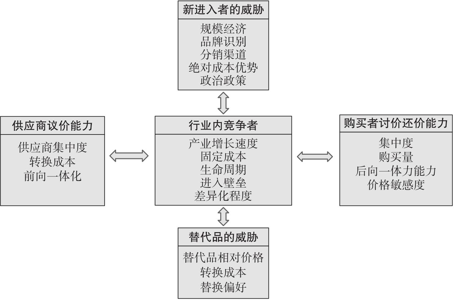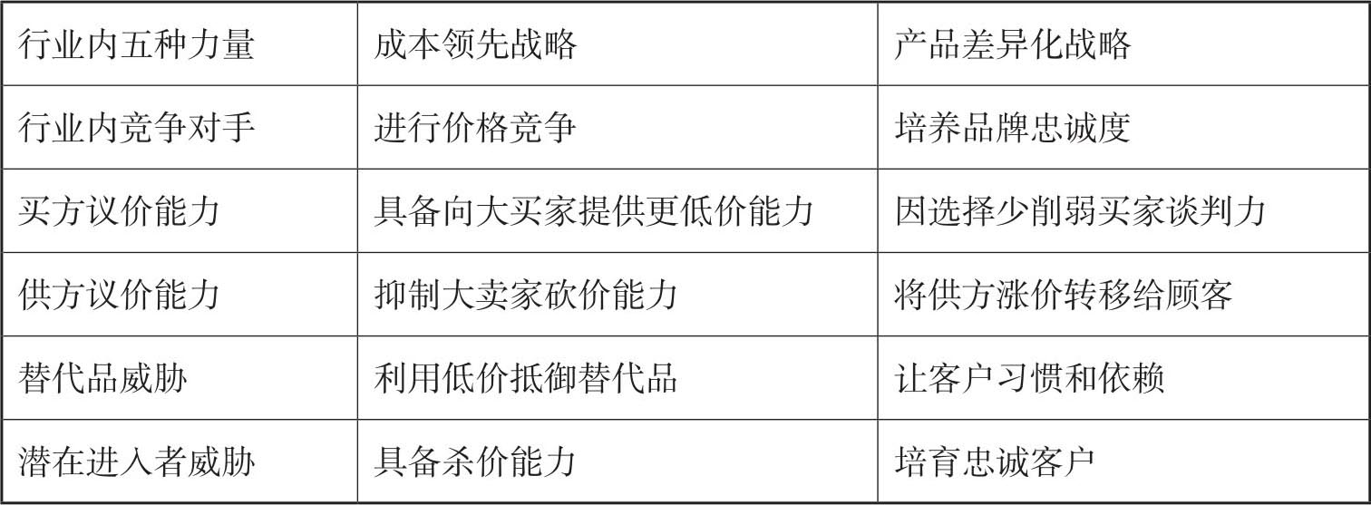 表2-1 五力模型分析与三大战略组合使用矩阵