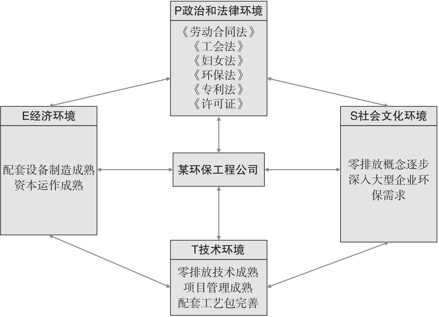 为了便于HR朋友理解,抽象宏大的PEST如何与具体的组织或公司关联,下面以为某家环保工程公司的PEST分析做示例如下图: