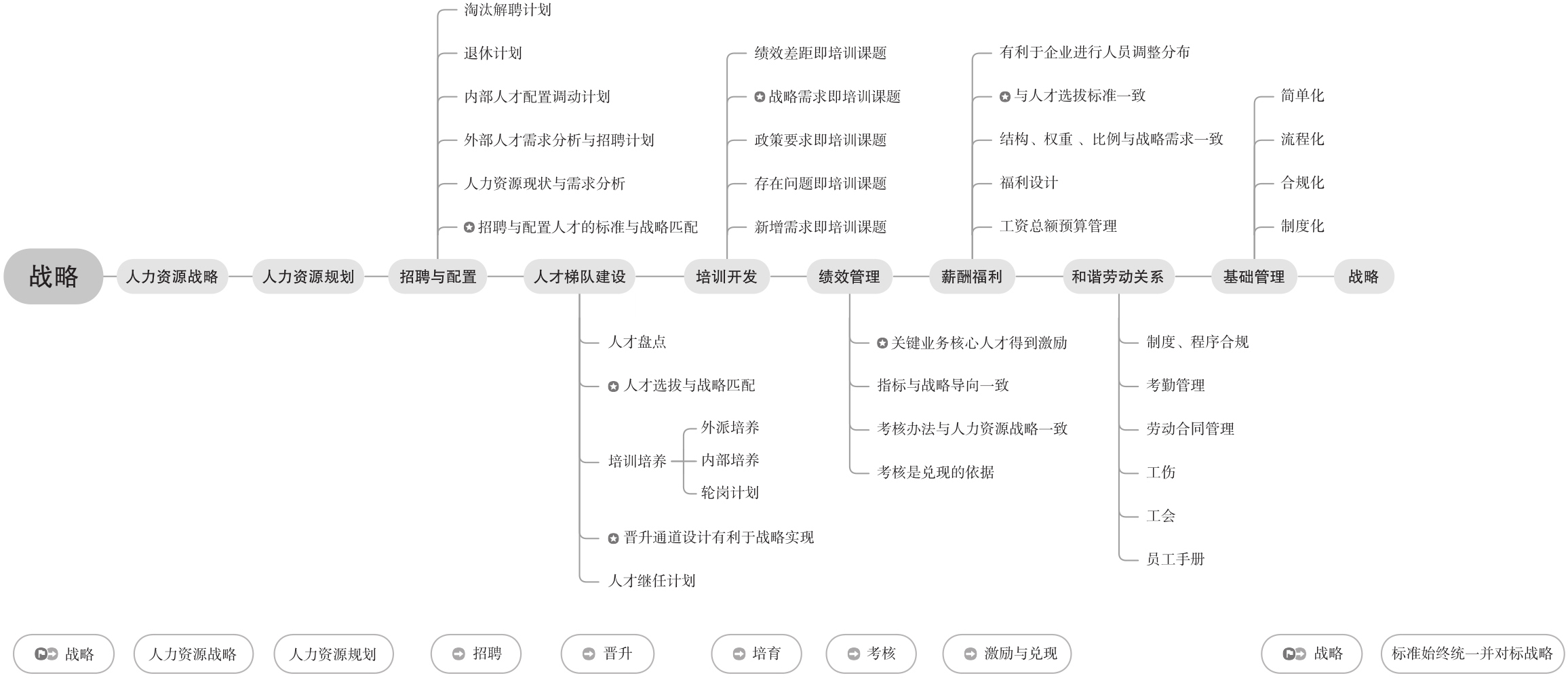 1.招聘与配置:最重要的是保障招聘人才与企业战略、人力资源战略要求一致,并能够通过素质能力模型标准化。