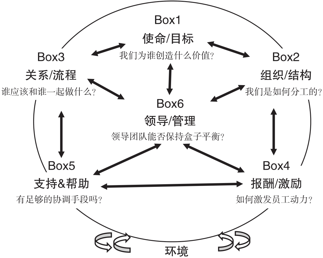 六个盒子也叫韦斯伯德的六盒模型,是1970年创立的经典组织诊断工具。支付宝团队在2010年引入这个工具,2013年广泛应用到天猫、阿里云、菜鸟等团队。在阿里巴巴内部,六个盒子在组织内部视角、不断检视业务实现过程发挥着至关重要的作用。