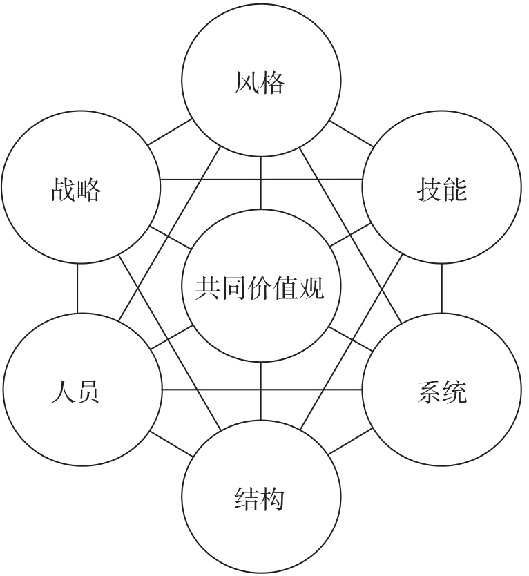 麦肯锡管理顾问公司所采用的7S组织模型则定义了7个要素,包括战略、结构、系统、人员、风格、技能和共同价值观。组织所拥有的、作为一个整体区别与个体所具备的能力。一些公司使用普通人却表现出超常的整体技能。