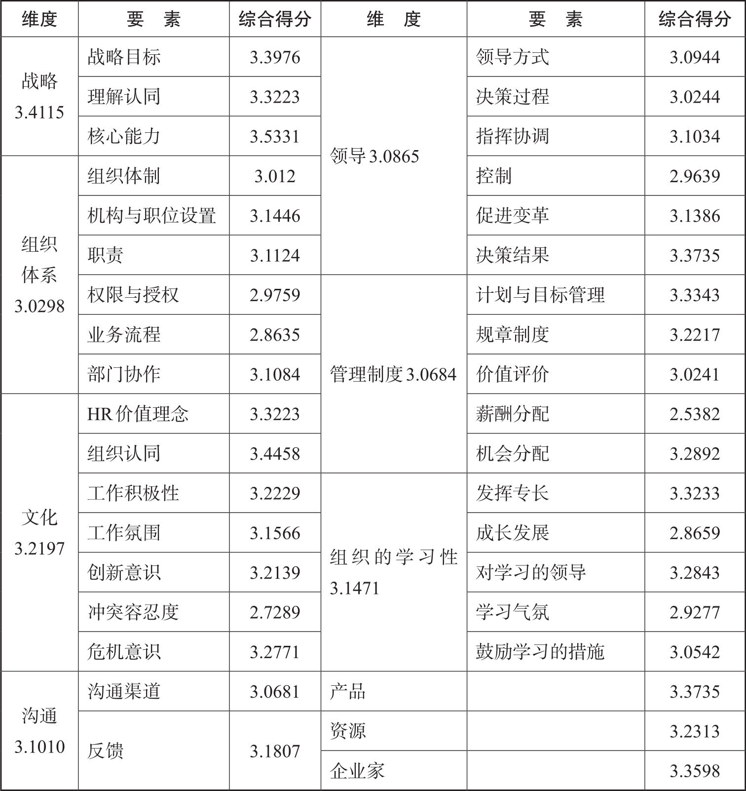 第二要因素是综合得分。组织健康问卷组织诊断的过程中要统计出一个分数,即使有很多维度。比如,组织体制治理,企业得了31分,是跟谁对比?一定是跟对标企业用同样的组织健康问卷去诊断,如果没有条件,就需要自评。可以半年做一次组织诊断,半年之后再去评比,每次评估不要更换工具甚至权重,评几次之后再去优化,这样就是一个非常大的优化性参考。