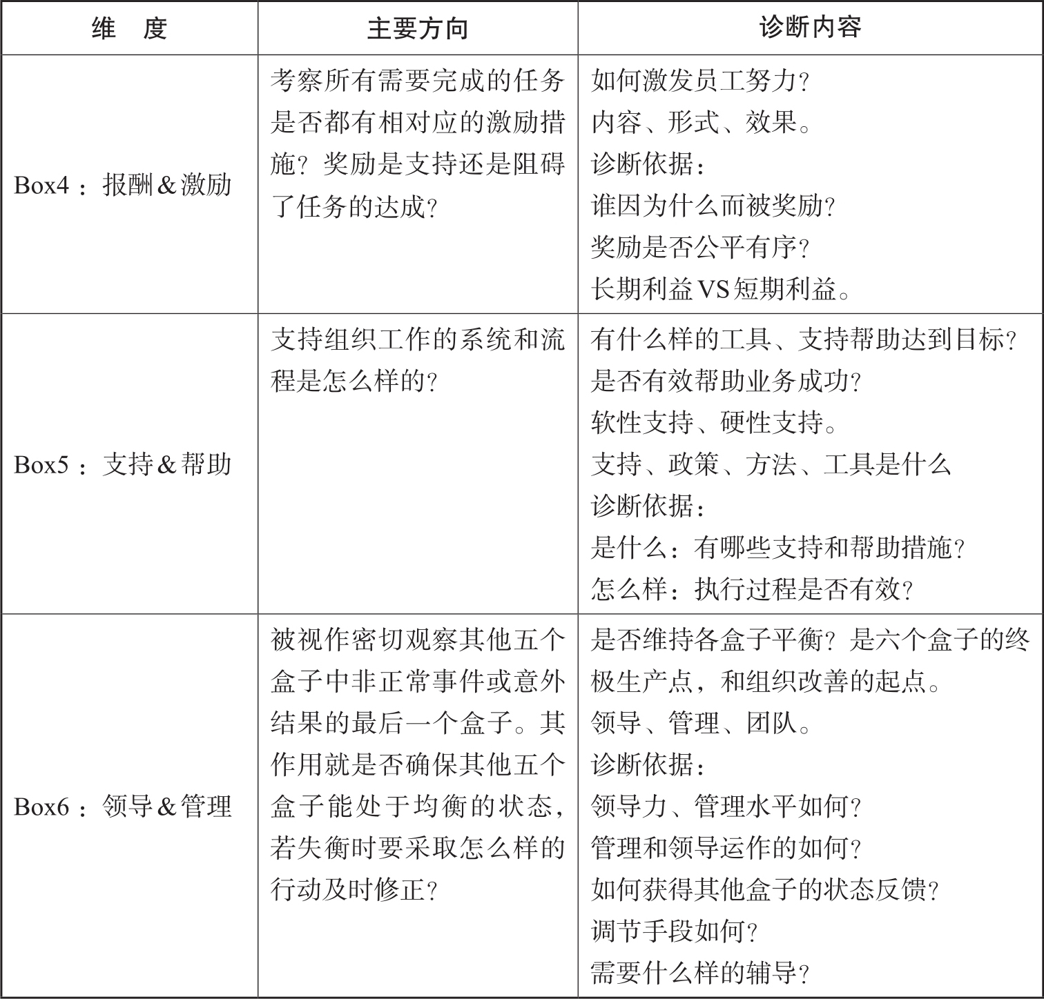 六个盒子也叫韦斯伯德的六盒模型,是1970年创立的经典组织诊断工具。支付宝团队在2010年引入这个工具,2013年广泛应用到天猫、阿里云、菜鸟等团队。在阿里巴巴内部,六个盒子在组织内部视角、不断检视业务实现过程发挥着至关重要的作用。