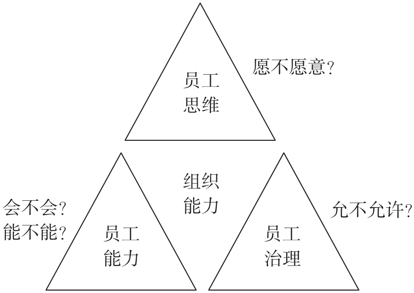 杨国安认为,打造组织能力需要三根支柱:员工能力、员工思维模式和员工治理方式。“杨三角”中的三根支柱是有顺序之别的,第一根必须是员工能力,即员工必须具备相关的能力或潜在技能,在找到具备所要求的能力的员工后,就需要第二根支柱——员工思维模式发挥作用了。员工有能力并且也有意愿之后,接下来就是搭平台。在这个环节,企业必须考虑如何设计组织架构、如何授权以充分整合资源、流程及系统等问题。即会不会、愿不愿意、允不允许三个方向的问题。