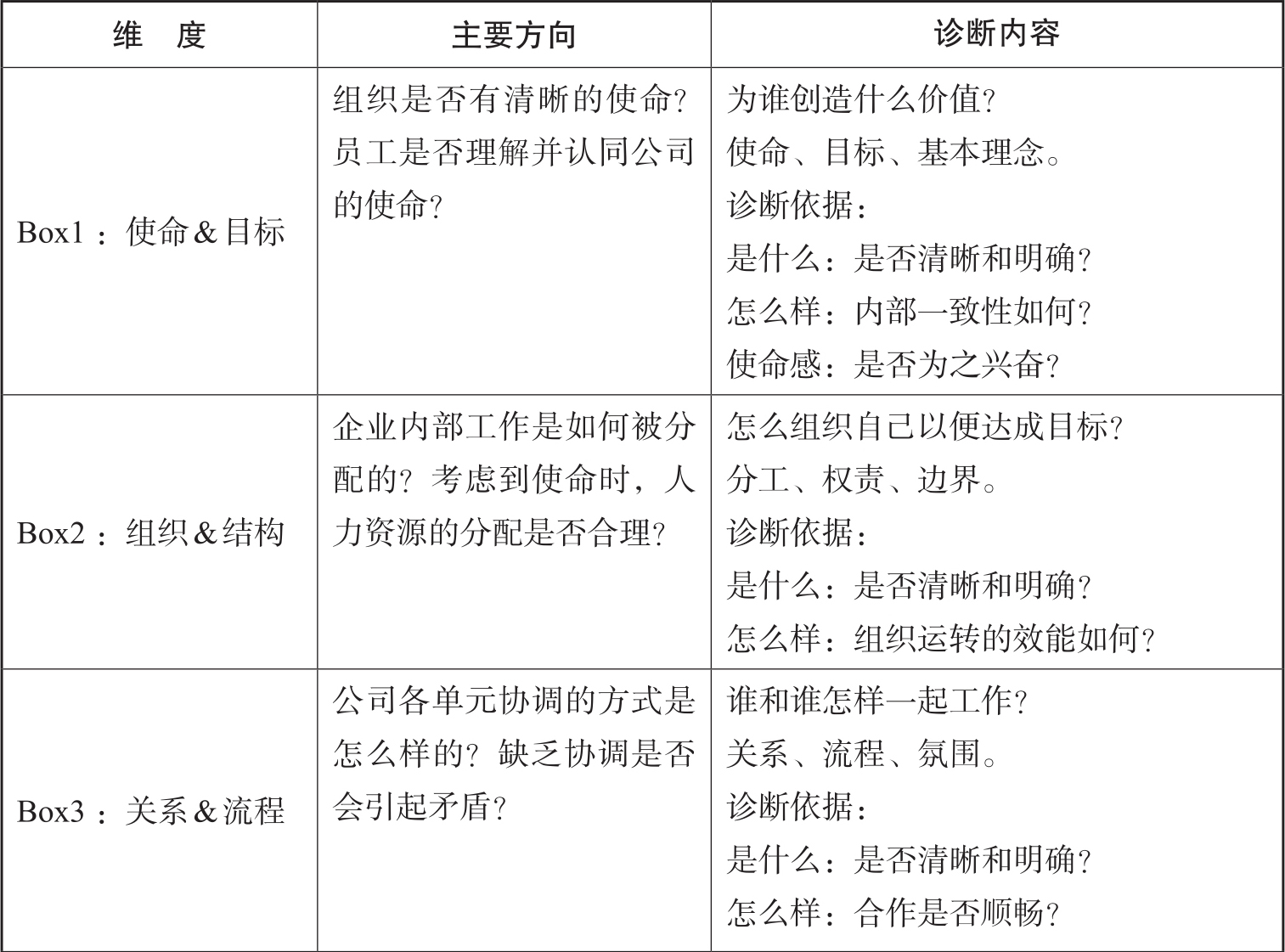 阿里使用六个盒子,说明阿里非常重视目标的实现,非常重视企业的有效性。这是他们整体输出的,一看那六个盒子就看到他们的价值观了。回到自己的企业里头,企业的目标是不是一定很重要?很重要的话,可以用六个盒子的诊断模型去套用。如果更强调的是一种良好的机能,可以把结构放在最上面,用结构来诊断整个事情。