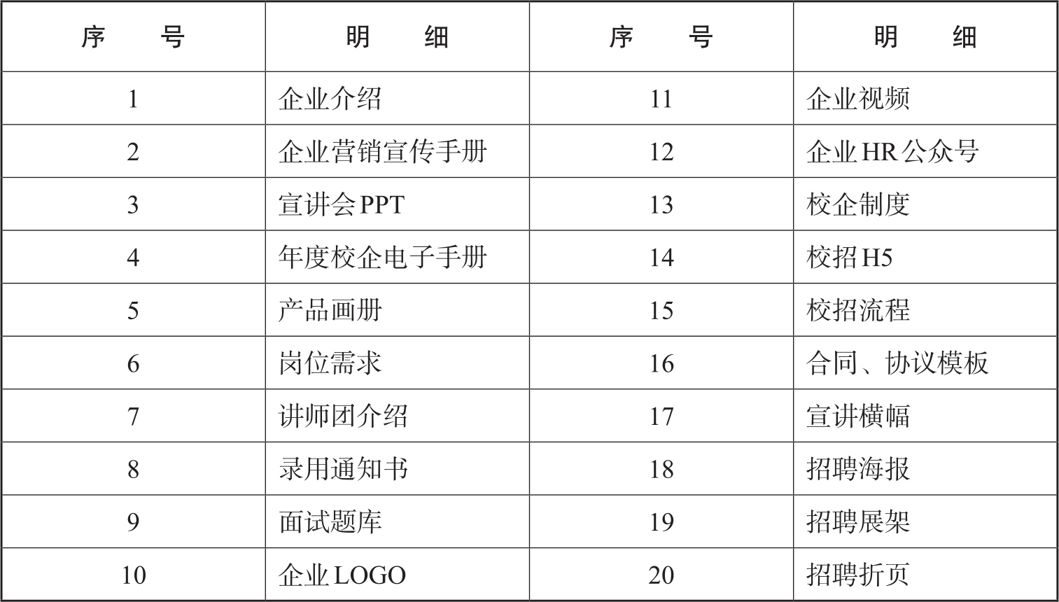 在招聘的过程中,我们需要用到画册、条幅、易拉宝等非招聘行为本身,但可以更好地支撑到招聘效果的一系列物品。这些物品或者事项就是工具,其中包括公司简介、招聘折页、易拉宝、公司视频、易企秀、H5页面、微信公众号、招聘网站,等等。下表是企业常用的招聘物料详情。