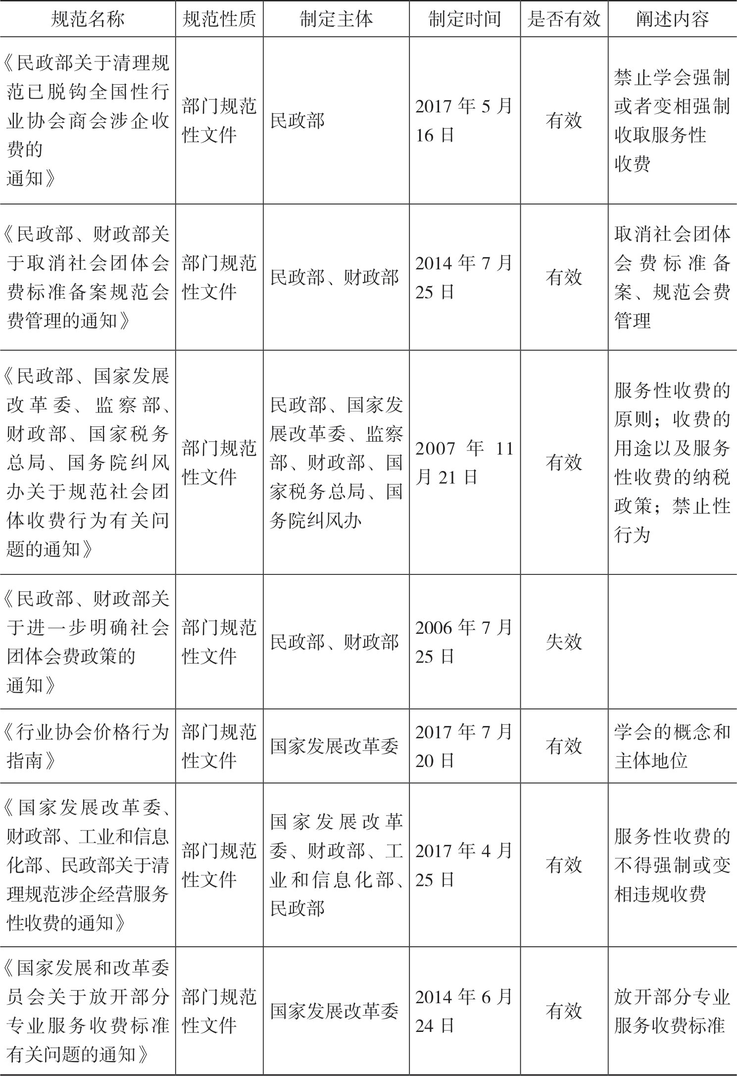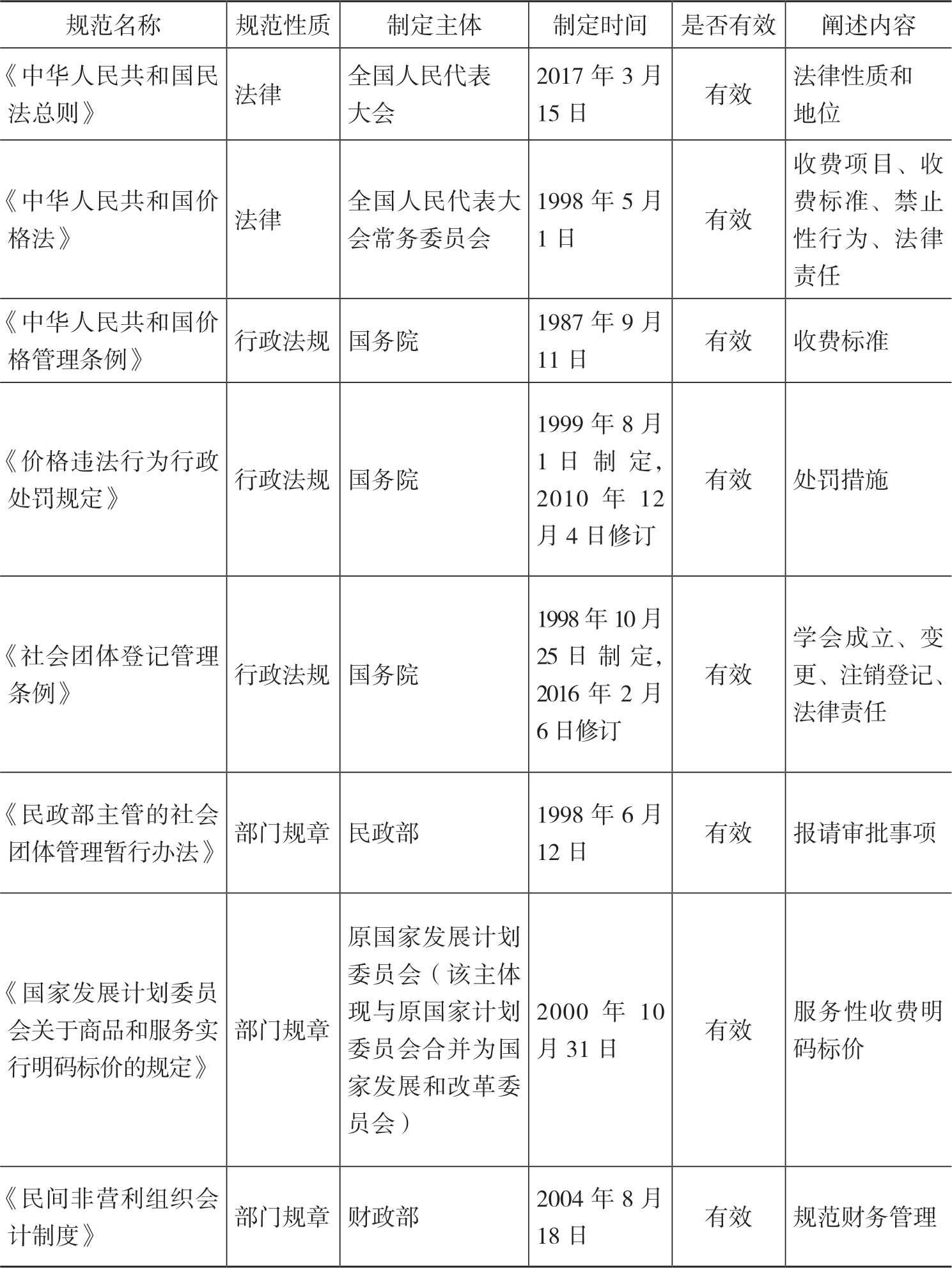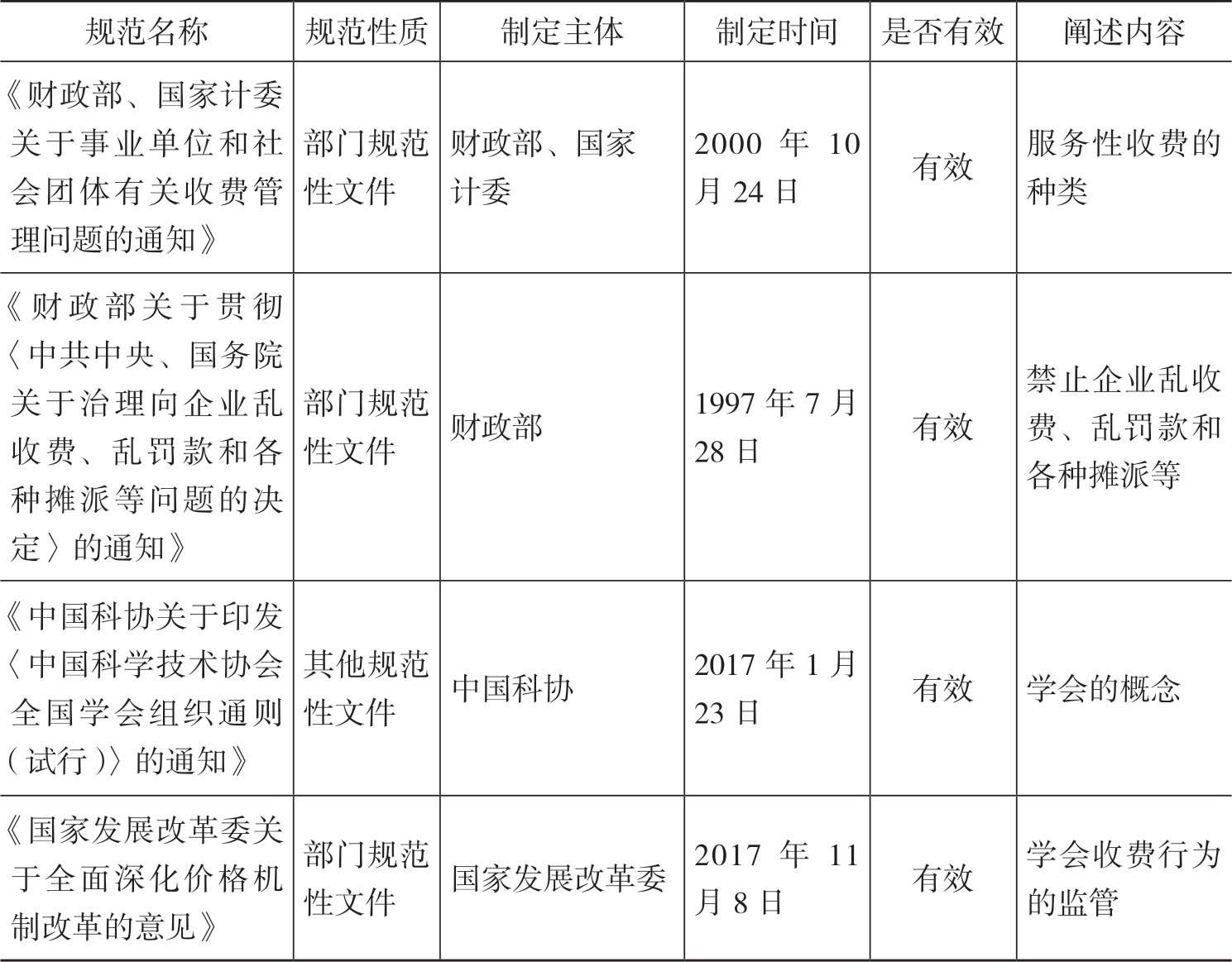 当前的法律规范并没有直接针对学会的服务性收费进行具体规定,因此学会的服务性收费目前呈现较零散的状态。本节将根据相应的事项,分别梳理服务性收费的政策法律规范。