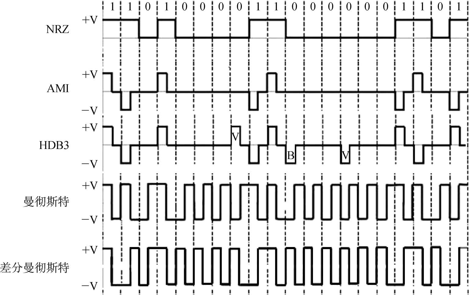 我们可以从图2.1来理解HDB3的编码规则。观察图2.1顶部的NRZ码中第一次出现4连0时,因为此前没有发生过取代码V,执行第2步将0000转换成000+v,B等于0无须变换。接着NRZ码中又出现了第二次4连0,执行第2步时还是转换成000+v(请注意,这时码流中的+v和-v的个数已经不平衡,数据流中出现了正的直流分量)。再执行第三步,因为本次V和上次V之间的非0个数是偶数(2个),所以B不能取0值。因为B之前的非零码是+v,所以B必须取值-v,替代码就成了-v00+v。然后执行第4步,在第二步中替换的V应要与B一致,所以4连0的替代码就变成-v00-v。从图2.1中展示的HDB3最终结果可以看出码流中的+v和-v数量重新达到平衡。此后的码流仍然按正常规律转换极性。从上介绍可以看出V码插入破坏了正常的编码规律,导致码序出现了直流分量。插入B是为了恢复直流分量的再平衡,使输出信号中的直流分量平均值重新回到0。
