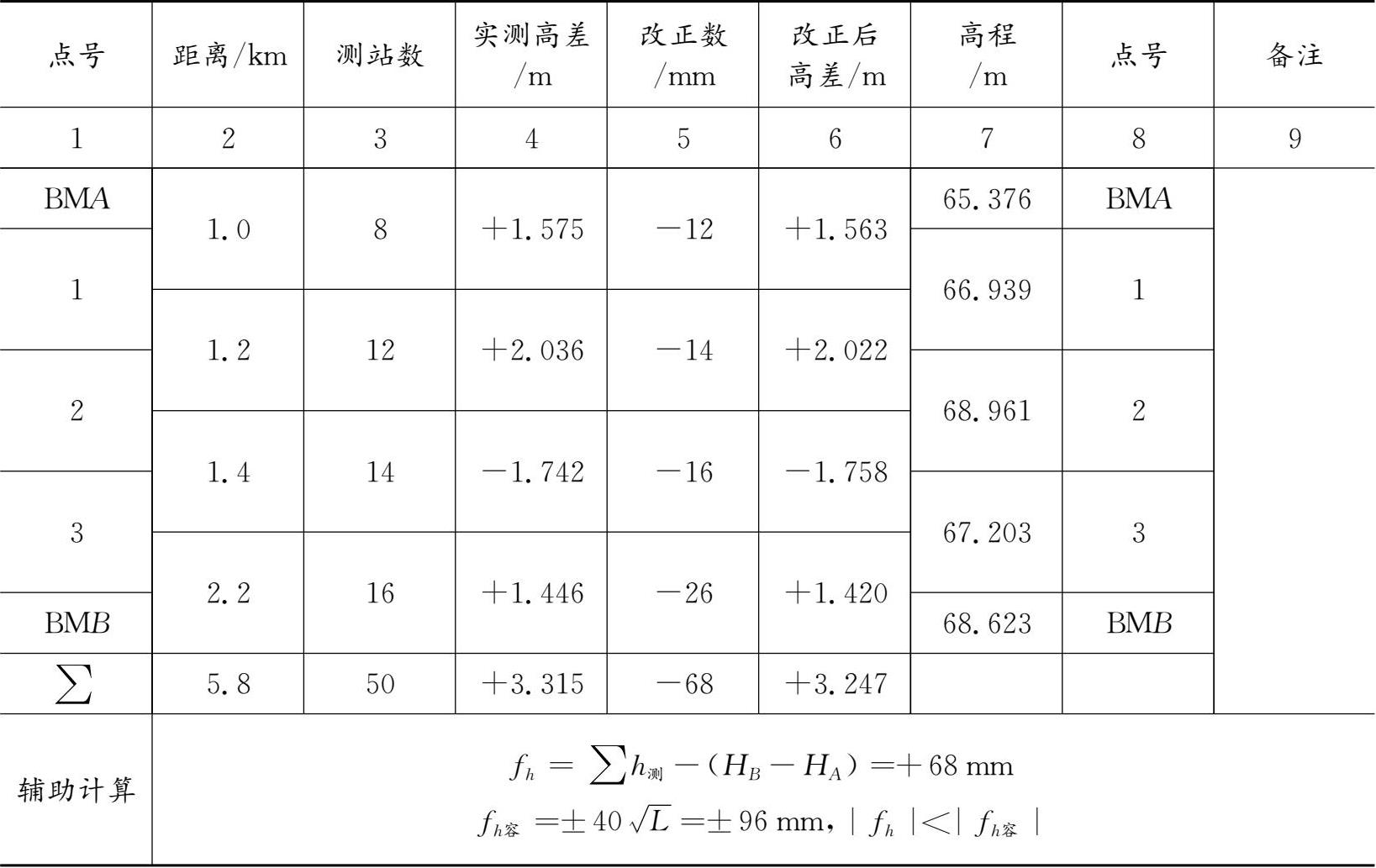 f h =∑ h 测 -( H B - H A )=+68mm