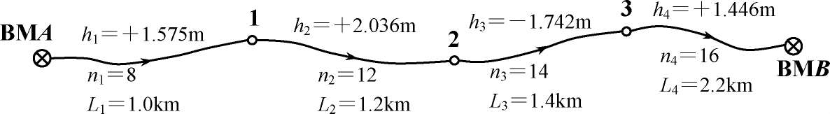 例1-1 图1-5-1是一附合水准路线等外水准测量示意图, A , B 为已知高程的水准点,1,2,3为待定高程的水准点, h 1 , h 2 , h 3 和 h 4 为各测段观测高差, n 1 , n 2 , n 3 和 n 4 为各测段测站数, L 1 , L 2 , L 3 和 L 4 为各测段长度。现已知 H A =65.376m, H B =68.623m,各测段站数、长度及高差均注于图1-5-1中。