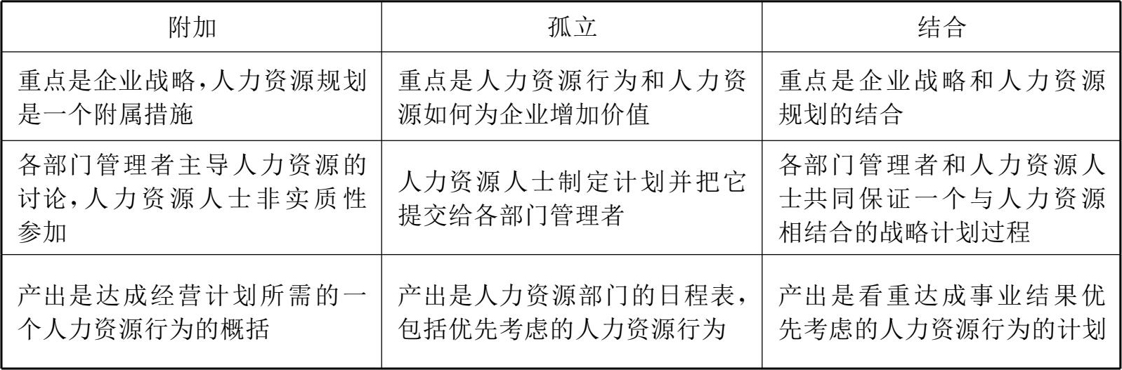 人力资源规划与企业战略的关系如表1-2所示。其一,人力资源战略规划相对于企业的战略和经营计划来说,相当于一个事后的药方。在这种模式中,只有在企业战略和广泛的经营计划确定之后,才会提及包括人力资源管理在内的经营管理相关问题,人力资源战略规划是作为企业经营战略规划的分支和附件出现的,涉及实现战略所需要的结构、竞争力、责任、企业和领导能力等多个方面。其二,人力资源战略规划是一个特殊的、分离的规划流程。人力资源部门不光得提出动议,还得设计和管理执行这些规划,并对这些规划的实施效果进行评估。如果人力资源部门以外的管理者很少或根本不关心制定人力资源战略规划,也不为之提供信息,那么在这种状况下制定的人力资源战略规划可能会因为脱离了企业的经营计划流程,所以只能为企业带来十分有限的价值。