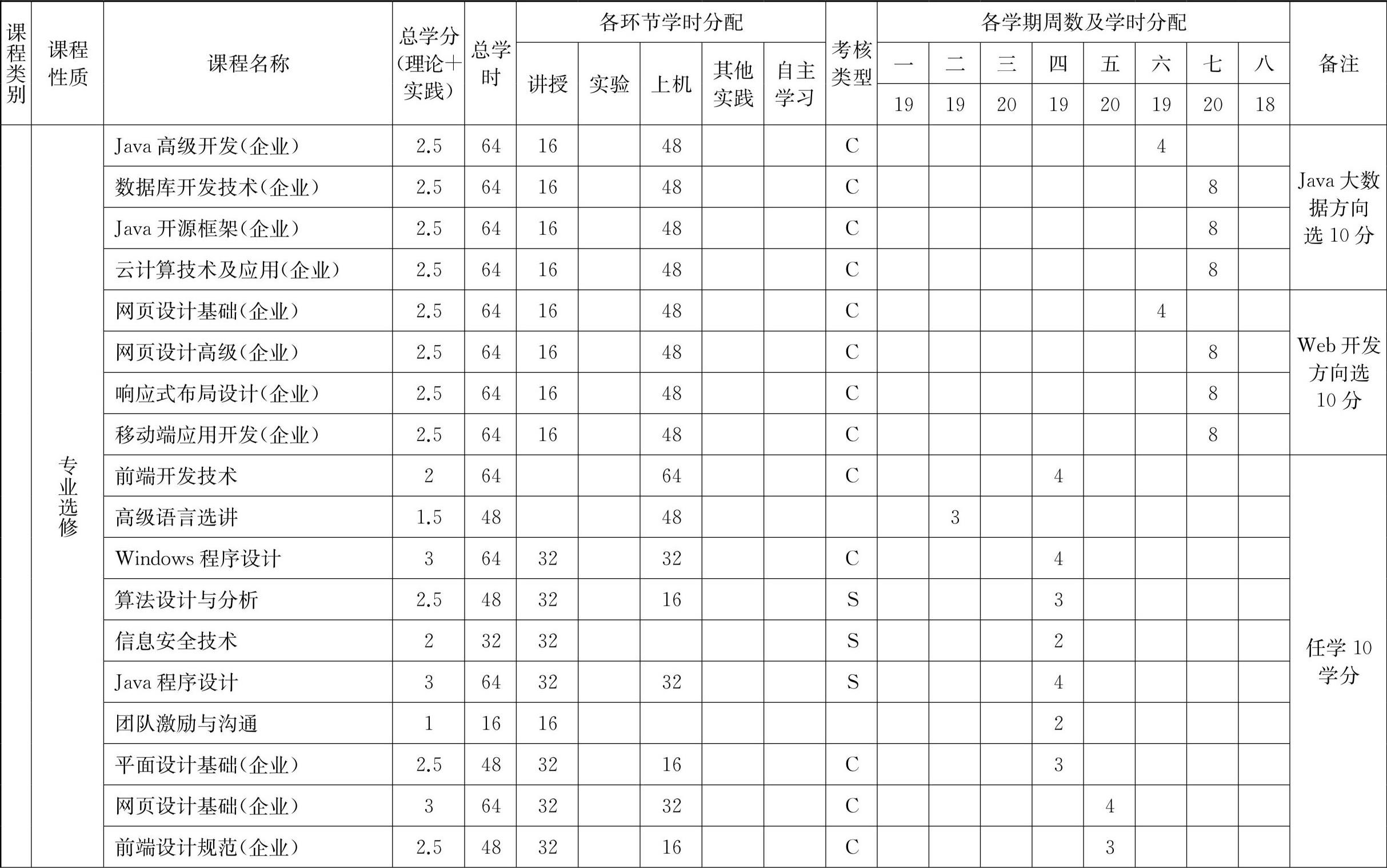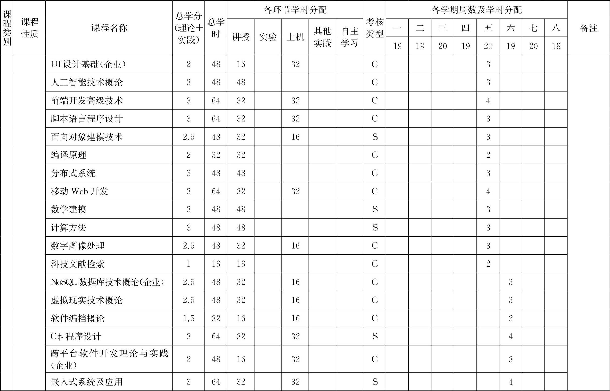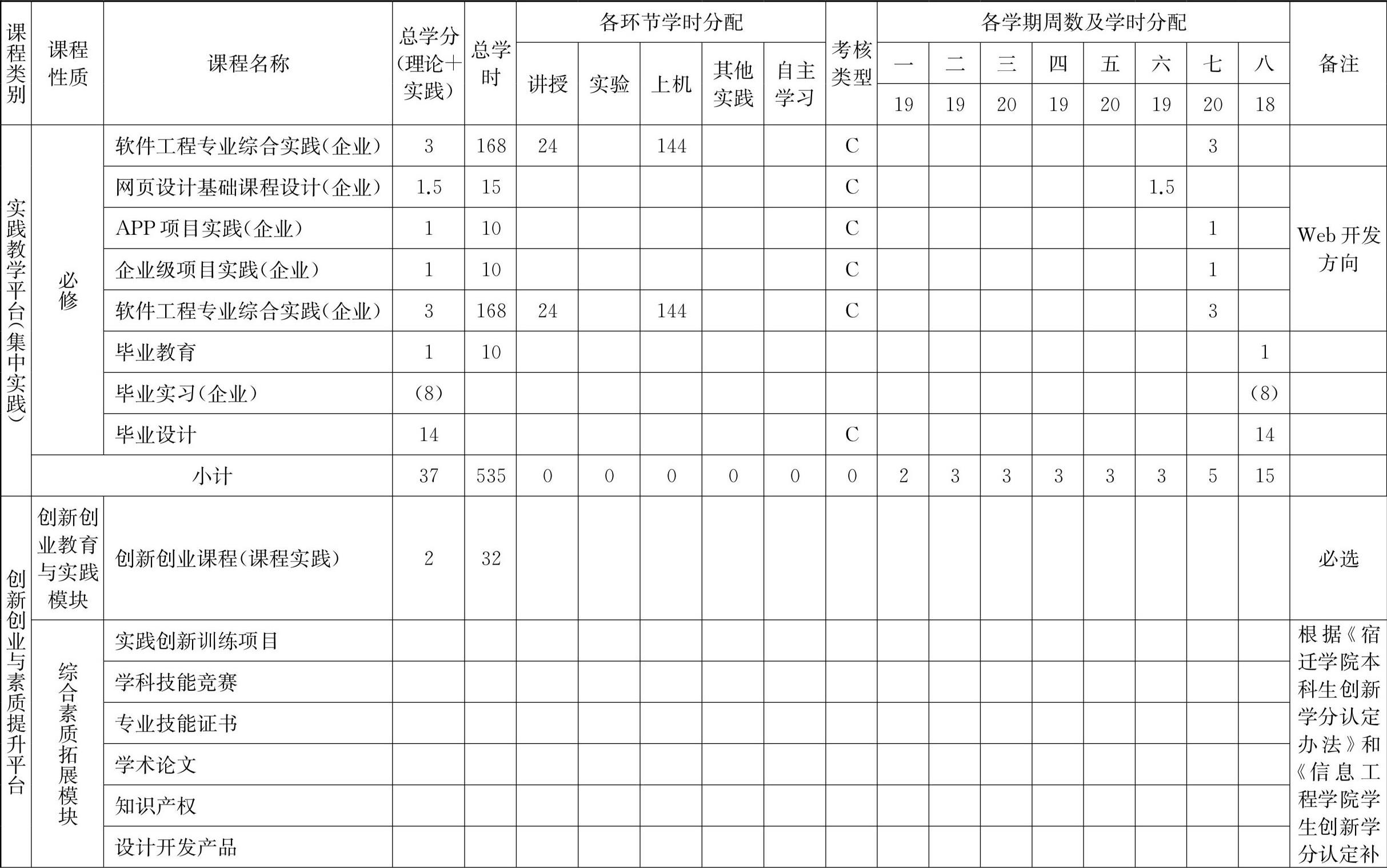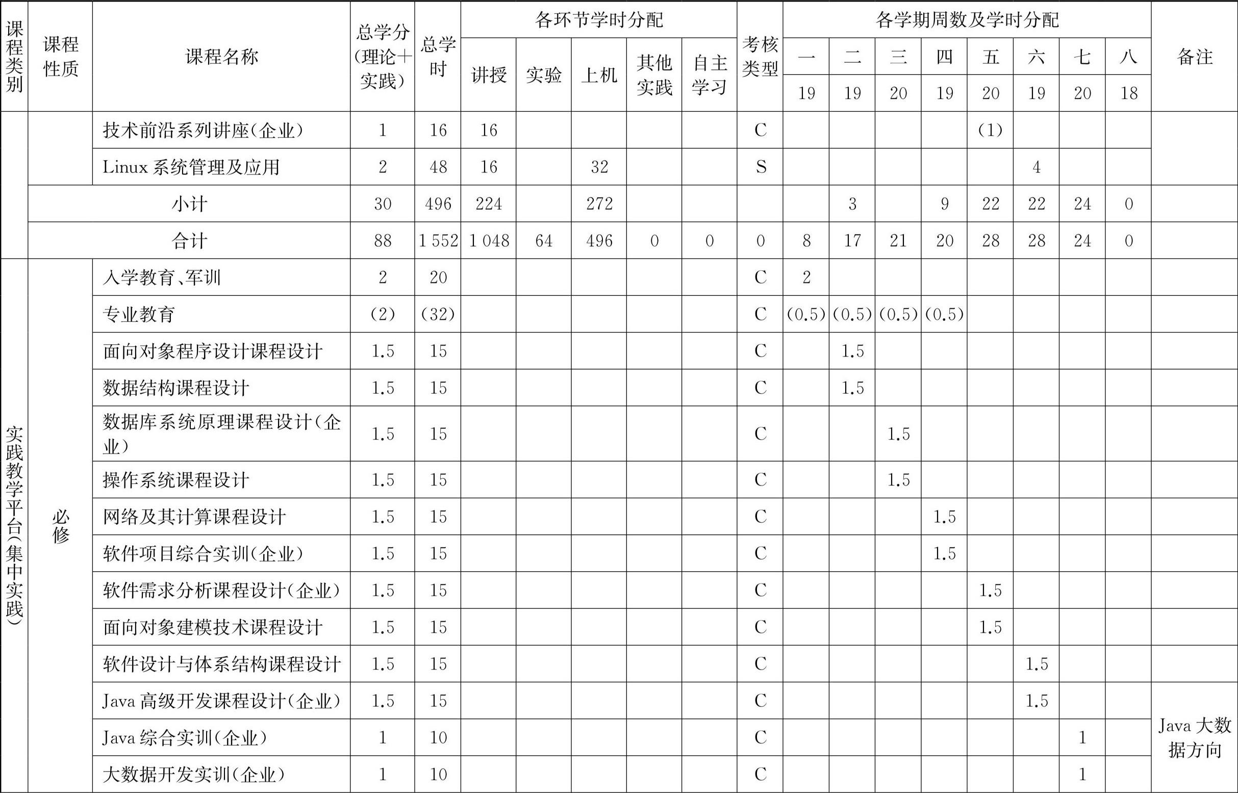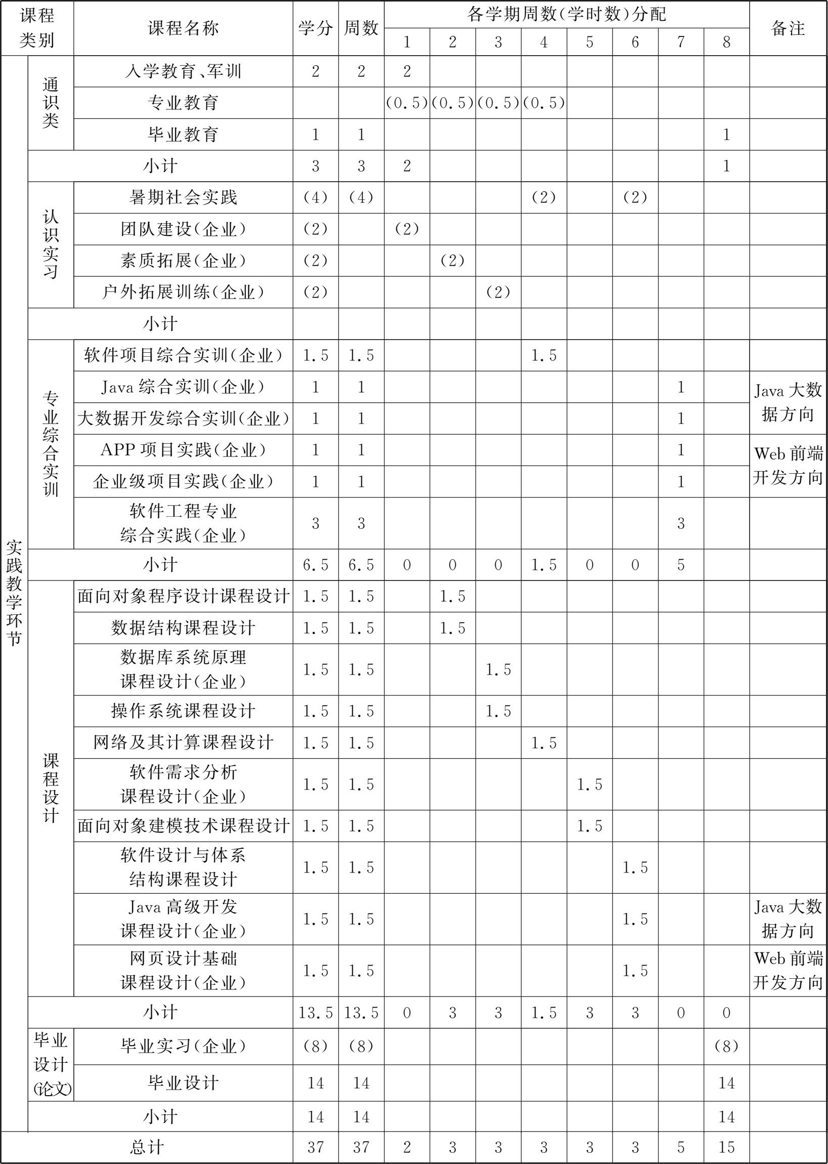 面向对象程序设计课程设计、数据结构课程设计、数据库系统原理课程设计、操作系统课程设计、网络及其计算课程设计、软件需求分析课程设计、面向对象建模技术课程设计、软件设计与体系结构课程设计、Java高级开发课程设计(Java大数据方向)、网页设计基础课程设计(Web前端开发方向)、软件项目综合实训、Java综合实训(Java大数据方向)、大数据开发综合实训(Java大数据方向)、APP项目实践(Web前端开发方向)、企业级项目实践(Web前端开发方向)、软件工程专业综合实践、毕业设计等。