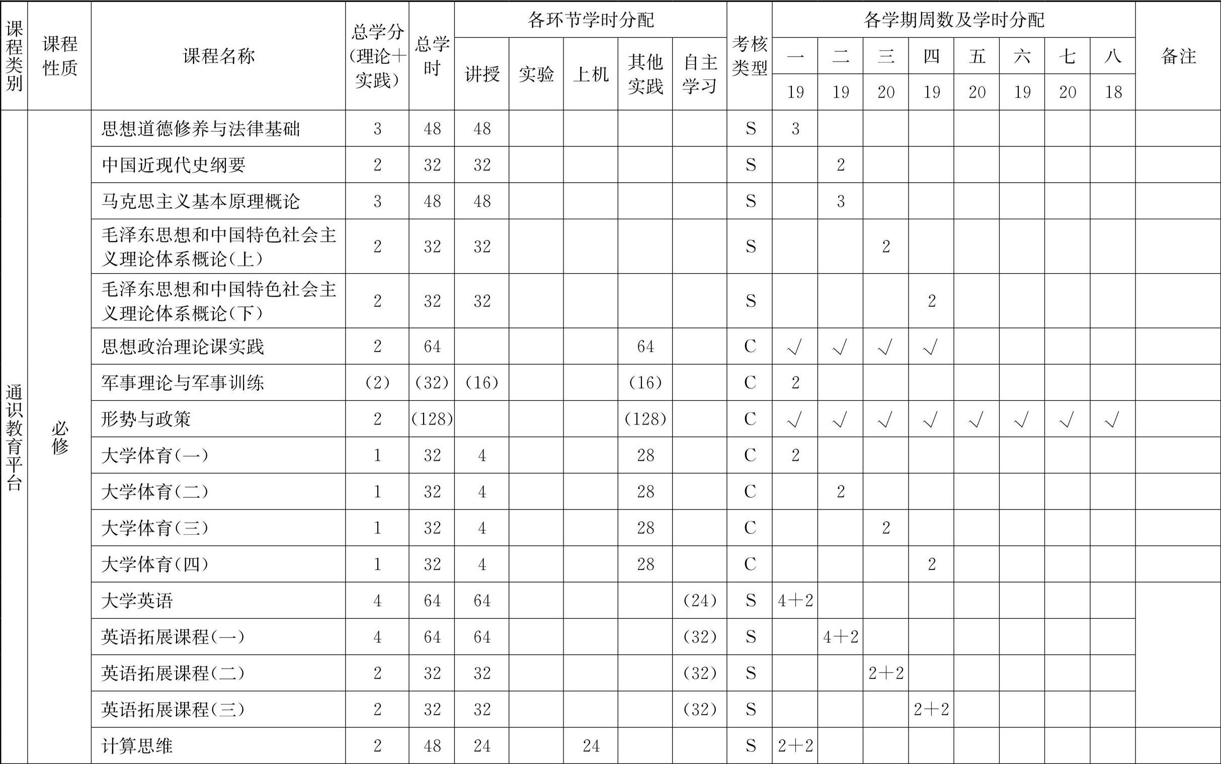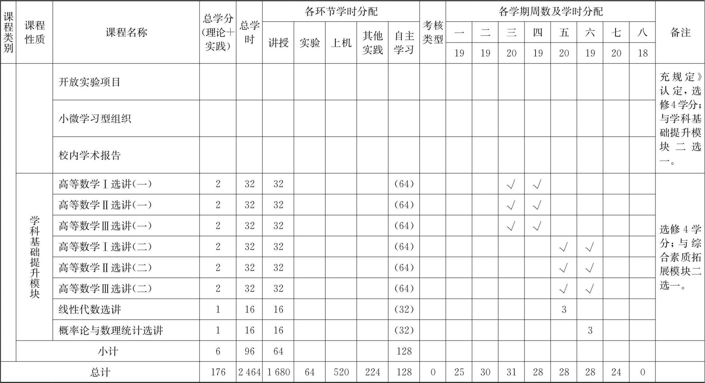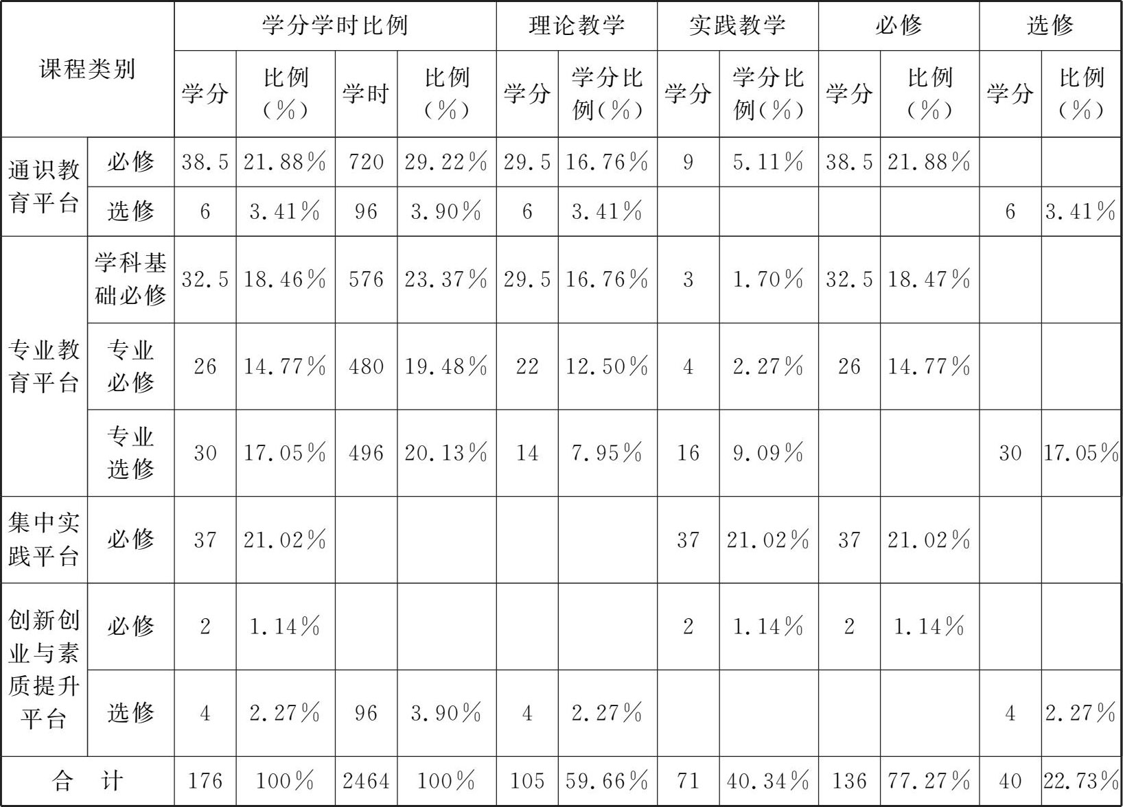 本专业学制为四年,允许修业年限为3—8年。毕业总学分176学分,总课时2464学时。