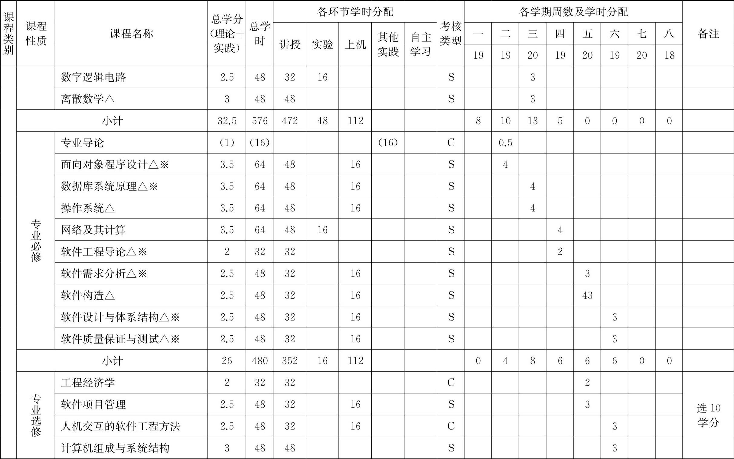 核心课程 :C语言程序设计、数据结构、离散数学、面向对象程序设计、数据库系统原理、操作系统、软件工程导论、软件需求分析、软件构造、软件设计与体系结构、软件质量保证与测试。