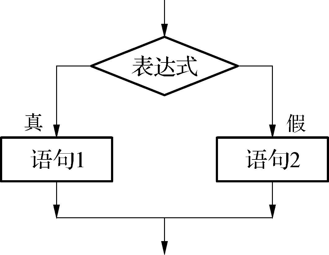 选择结构是根据判断某个条件是否成立,选择其中的一个分支执行。如图3.2所示,当表达式的值为真时即表达式判断条件成立则执行语句1,当表达式条件不成立执行语句2。