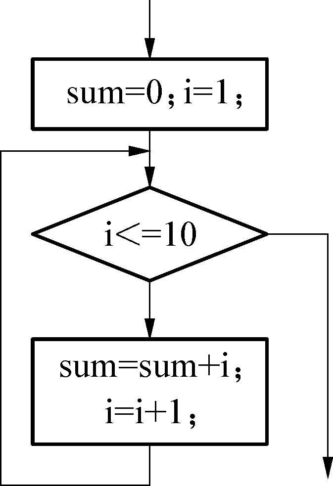 由上述分析可以知道,需要重复的部分是“sum=sum+i;i=i+1”;即循环体为“sum=sum+i;i=i+1;”,判断条件为“i<=10”。流程图如图3.5所示。