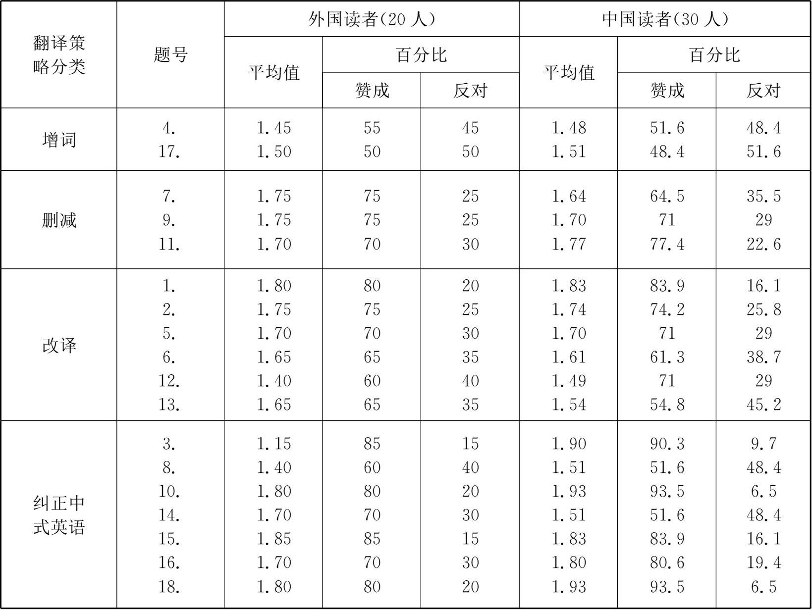 对这类翻译策略,受试者选“赞成”的平均值最低为1.49,最高达到1.83。汉语惯用四言八句,对偶平行的结构,声情并茂,诗情画意,但未免有些生涩难懂,纯粹渲染气氛。但是有些内容又不能省略不提。在这种情况下,为确保译文的流畅通达,必须对原文进行必要的改译,这样才能有效地吸引读者。