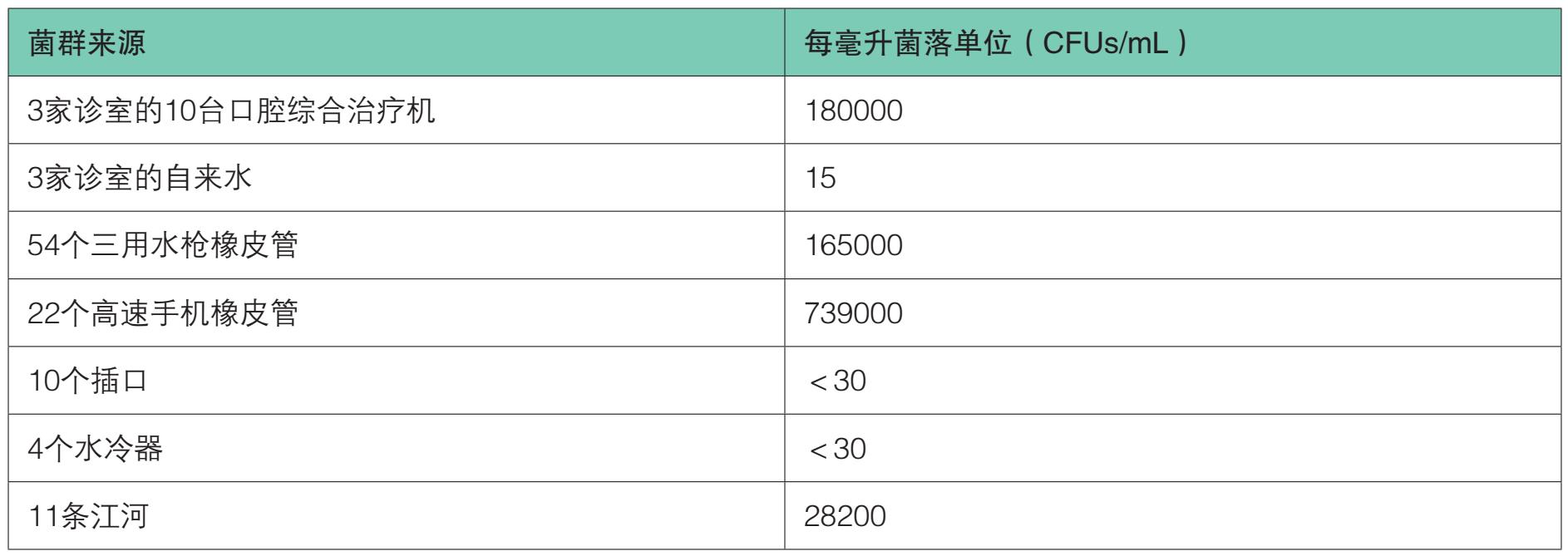 在公共供水中,许多水传播细菌保持低于500CFUs/mL菌落单位。来自口腔水枪和手机水中的菌落单位常常大于标准饮用水中细菌水平。来自口腔综合治疗机水中的细菌种类常常与公共供水中的细菌种类一致,但口腔综合治疗机中的细菌数量通常很高。研究显示,在新安装的DUWL中,5天内微生物总数能达到2×10 5 CFUs/mL菌落单位。曾有报道显示,微生物的数量甚至可以达到1×10 6 CFUs/mL菌落单位。