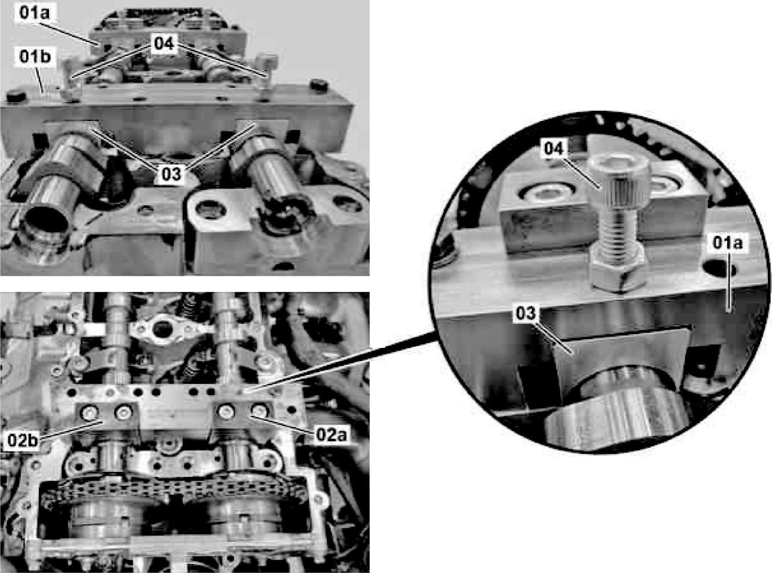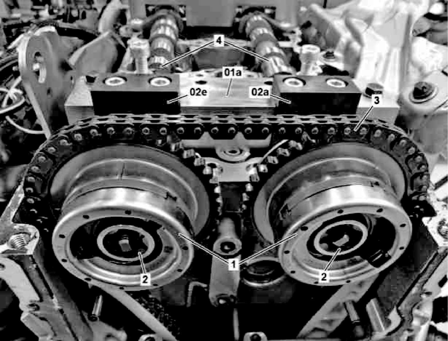 01a-压紧工具 02a-固定装置 02e-固定装置 1-凸轮轴调节器 2-控制阀 3-正时链 4-凸轮轴
