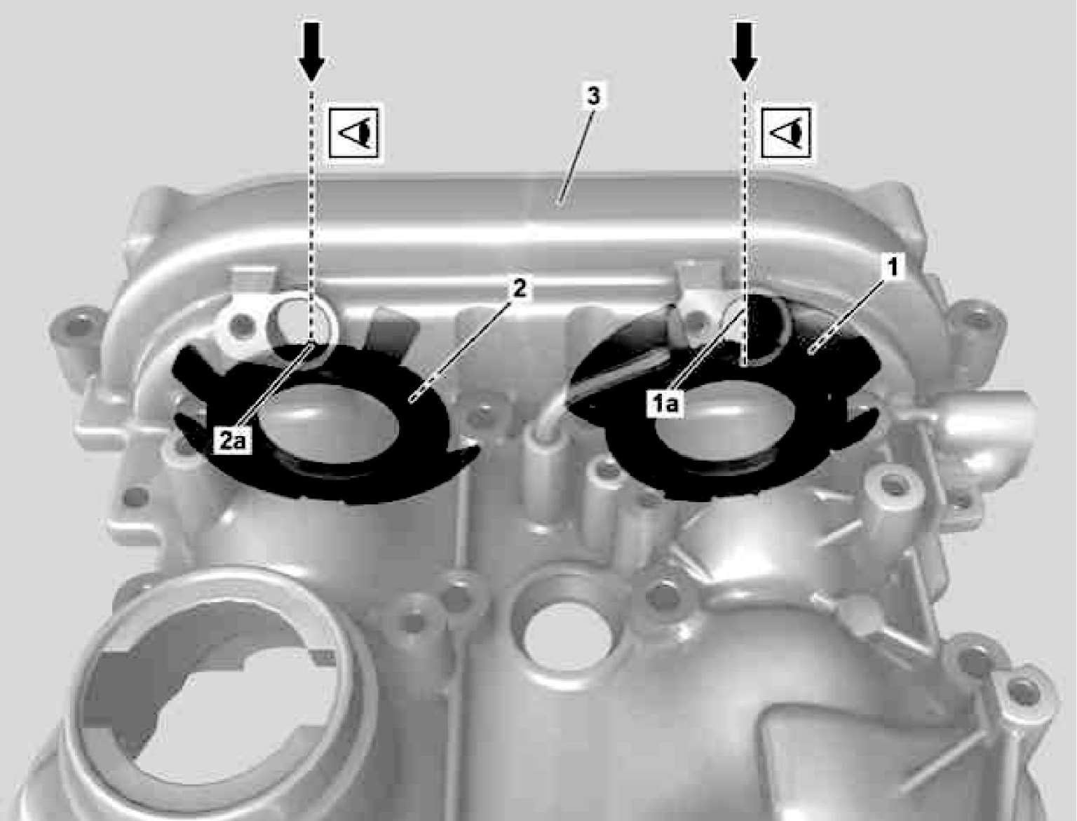 (3)检查凸轮轴的基本位置。若要检查排气凸轮轴调节,在霍耳传感器开口(图1-16)的中央必须可以看到扇形盘(如图1-16中1)扇形段的边缘(如图1-16中1a)。若要检查进气凸轮轴调节,扇形盘(如图1-17中2)的轴承狭槽(如图1-17中2a)必须位于霍耳传感器开口(图1-17)的中央。通过在气缸盖罩(如图1-17中3)的霍耳传感器开口上进行目视检查凸轮轴的基本位置。如果基本位置不正确,设置凸轮轴的基本位置。