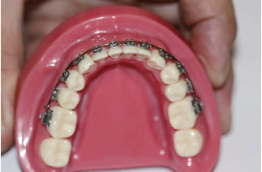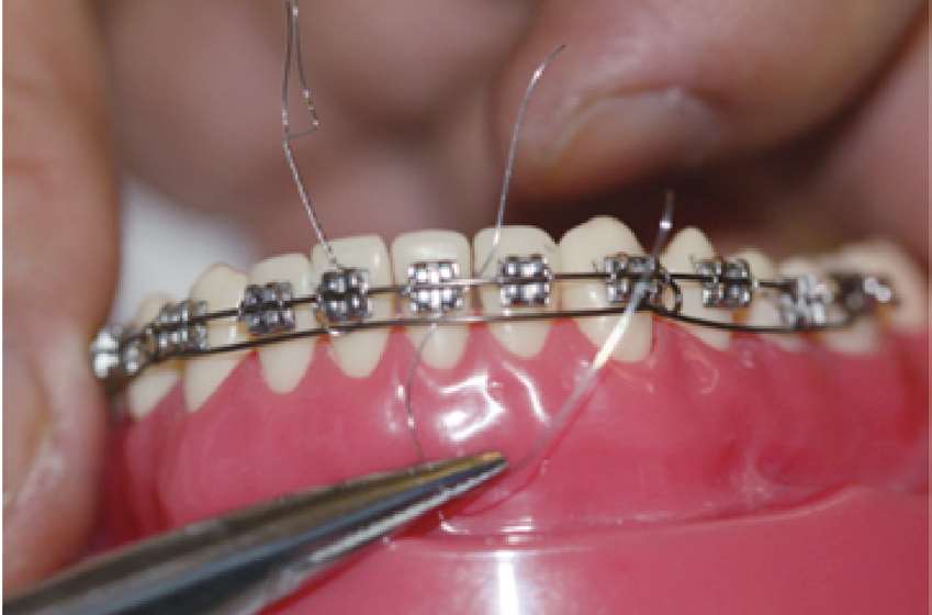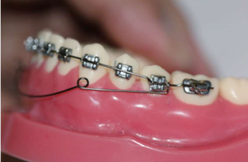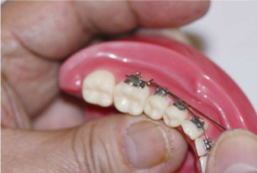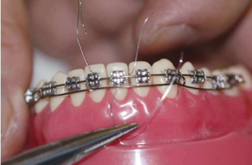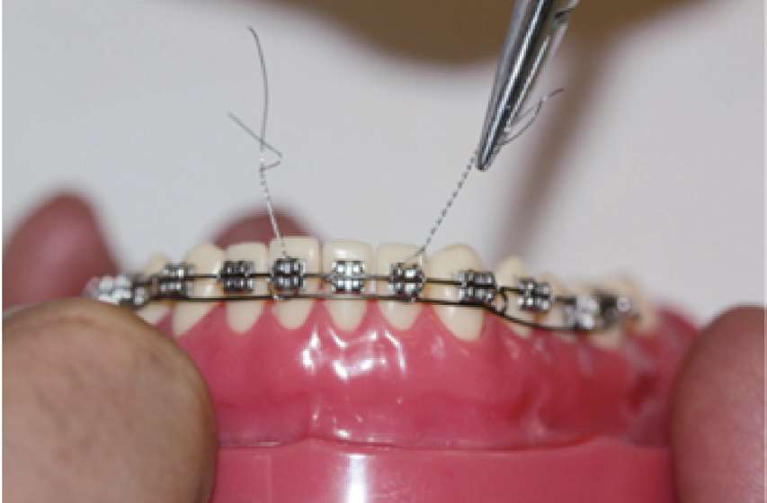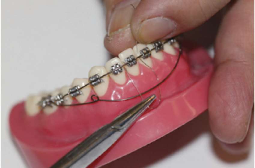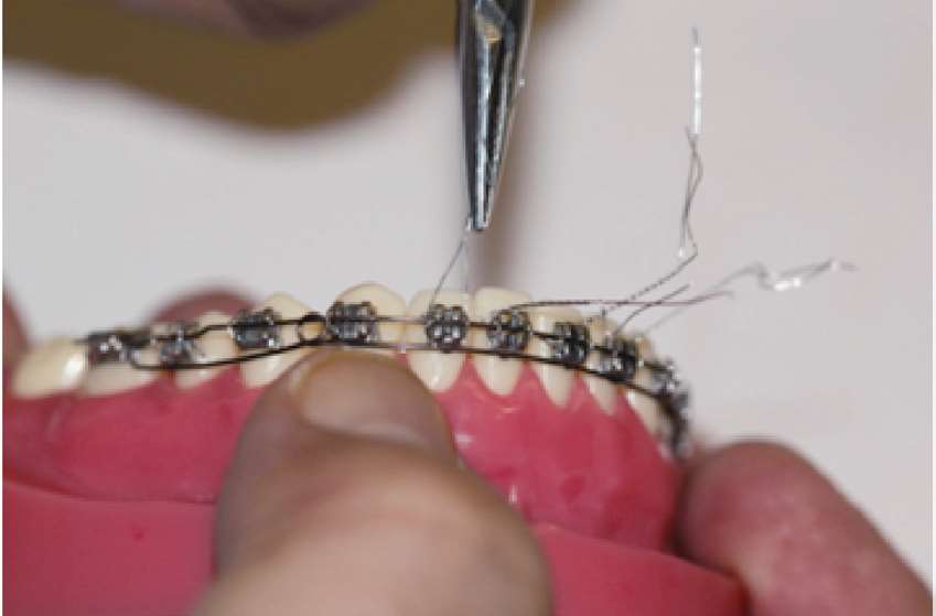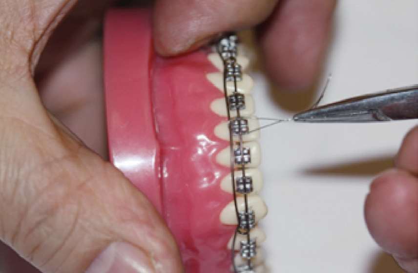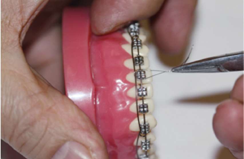 4.用0.25mm结扎丝分别套住蛤蟆嘴(前倾弯)段弓丝对应的其余3颗切牙,结扎丝均穿过每颗切牙托槽下方的主弓丝,用持针钳逐个夹住结扎丝朝切牙托槽