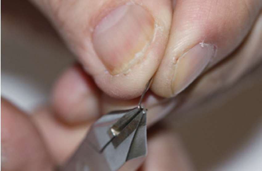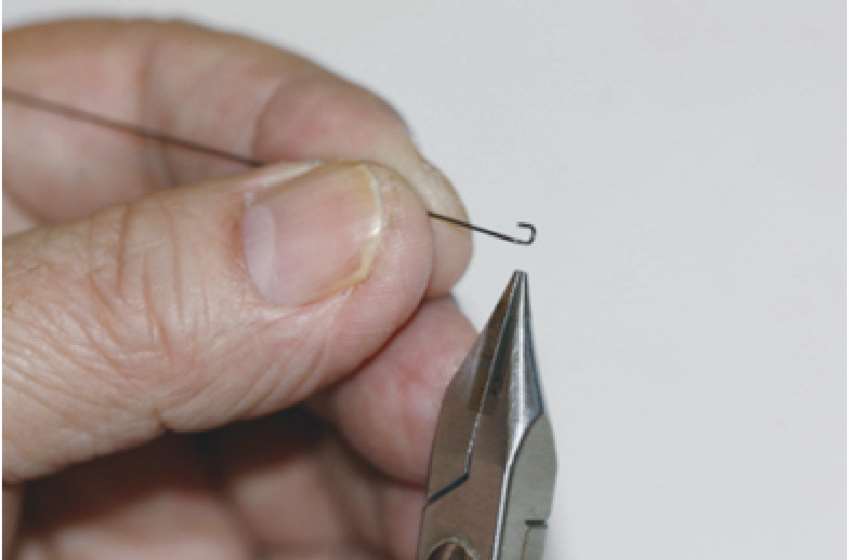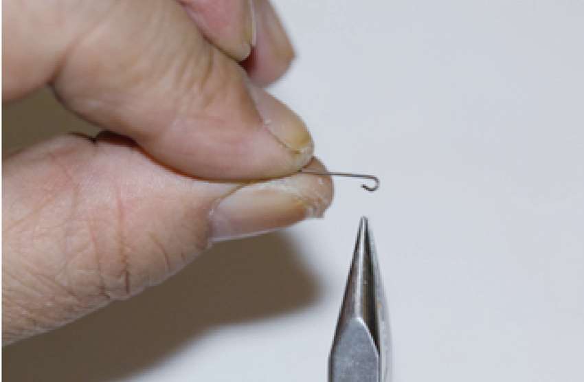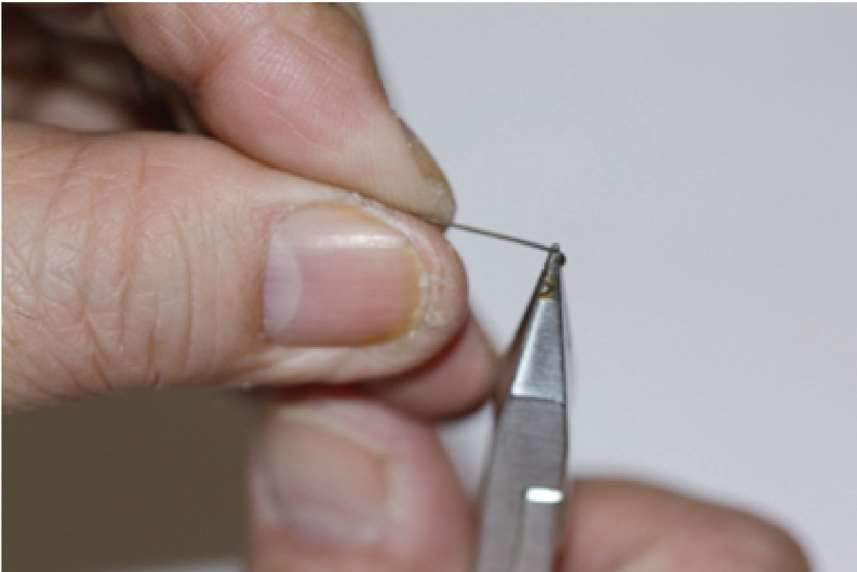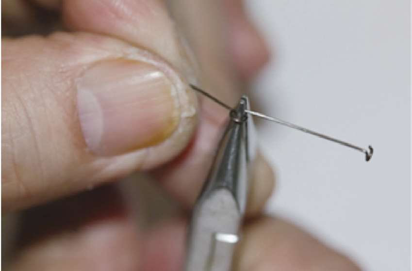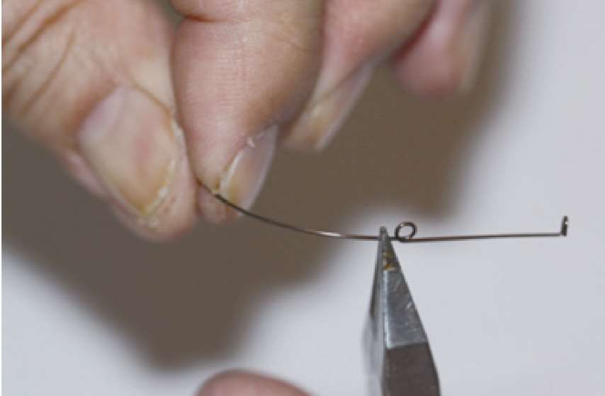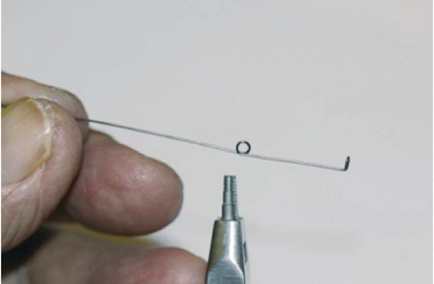9.用镊子作标尺,取弯制好的一端小圈曲与挂钩间的距离作标准(图7-2-27,图7-2-28)。
